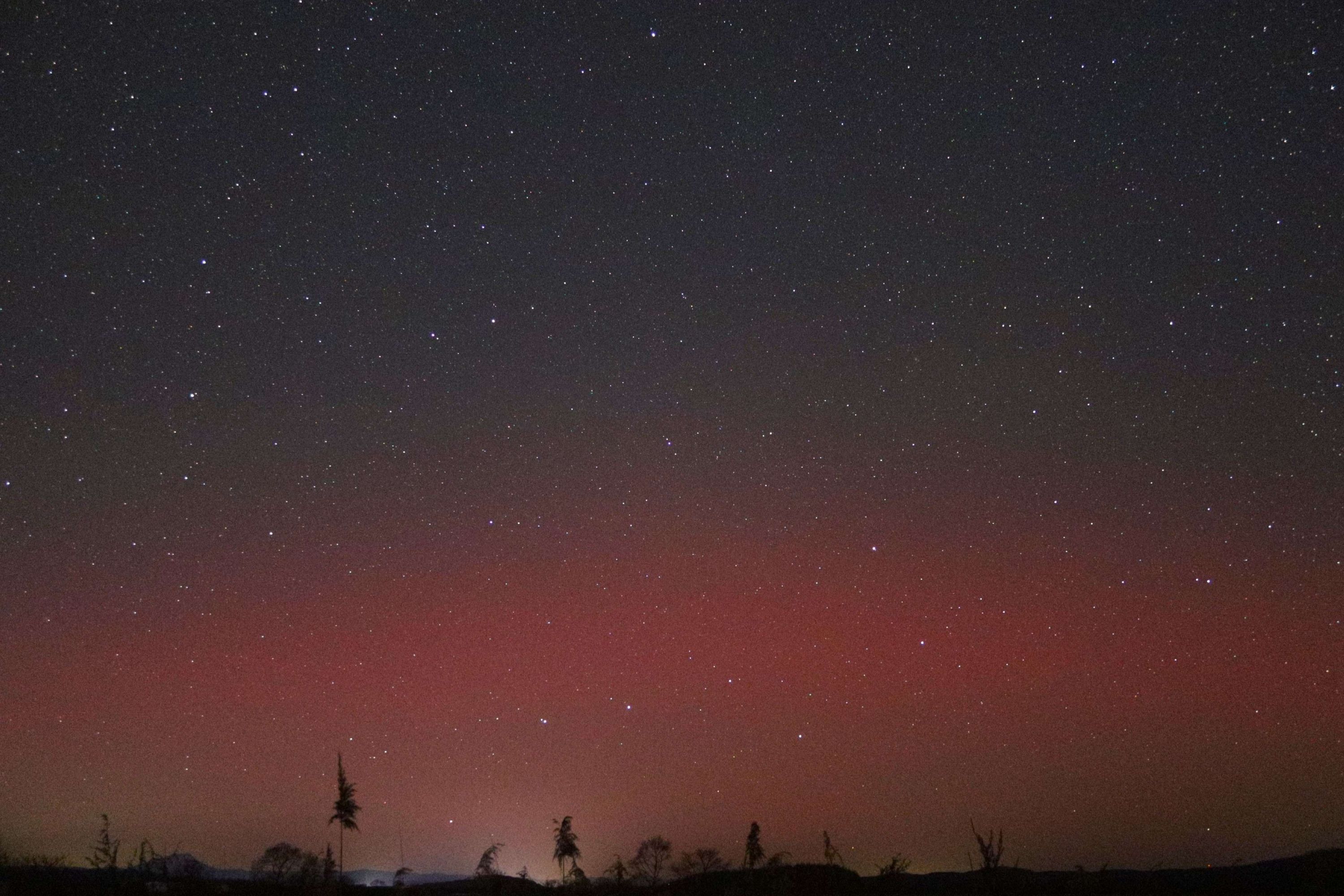 11月12日の低緯度オーロラです。 地平近くに下方通過中の北斗七星、真ん中上に北極星が写っています。 肉眼では、北の空が周囲より暗く、薄雲がかかっているような感じで、ほのかに暗赤色を呈して見えました。 この後、オーロラは徐々に薄くなっていきました。