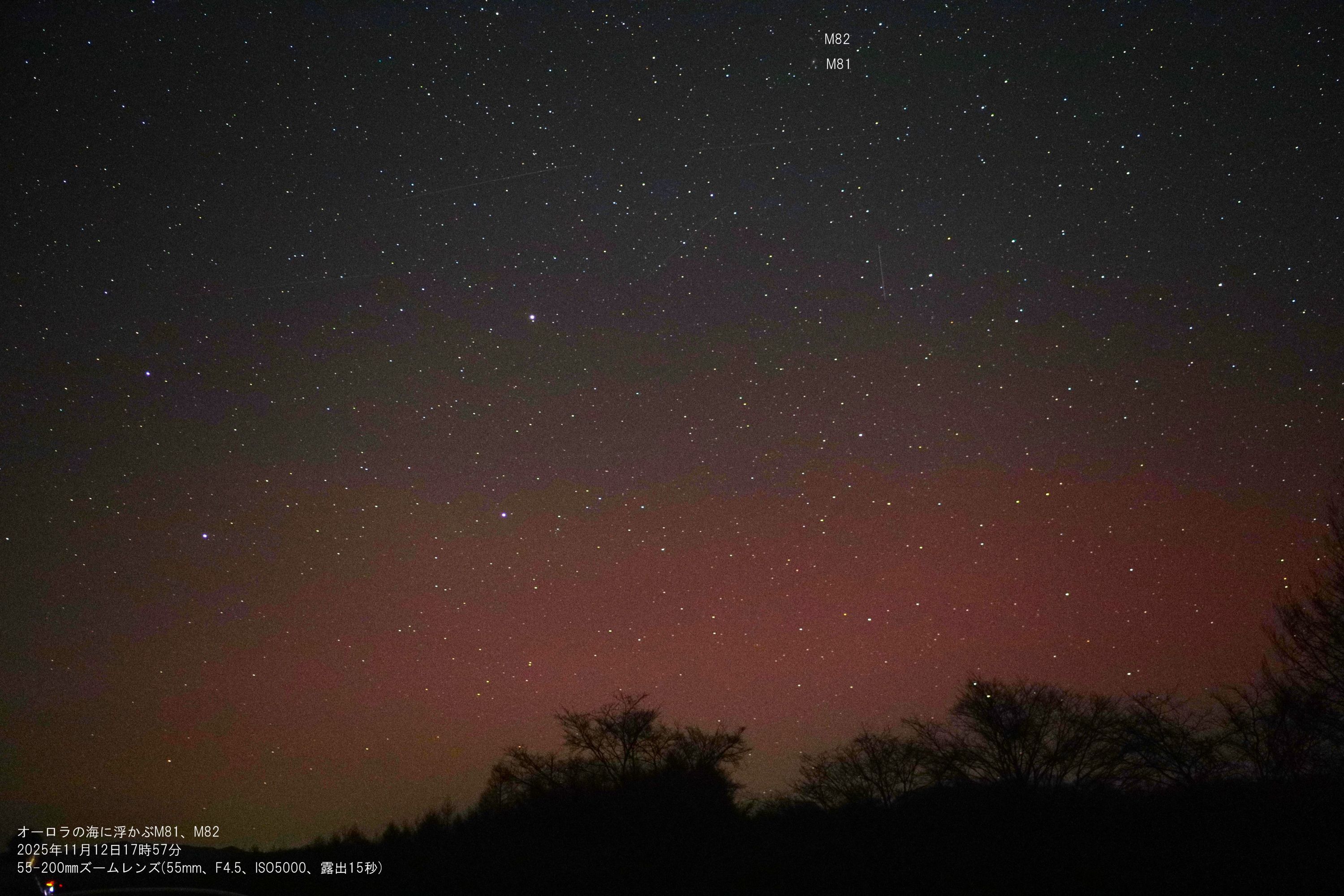 11月12日、レモン彗星を撮影していると星仲間からオーロラが出るかもと知らせを受け、彗星撮影終了後に慌てて北の空を撮影した1枚です。 あいにく彗星目的だったので広角レンズを持ち合わせず、55mmで撮影したのですが、そのおかげでオーロラの上方にM81とM82も一緒に写すことができました。