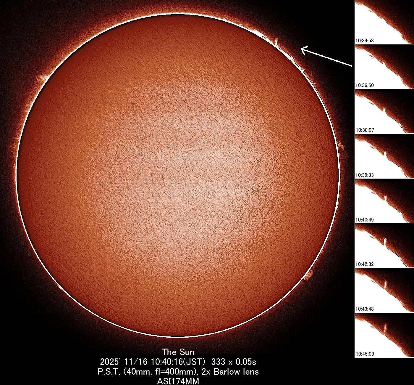 小さな黒点しか見えませんが、右上の縁のプロミネンスが数分で伸びる様子が写っていたので組み写真にしました。 なお、右のプロミネンスの画像は、露出オーバー気味で、ピント調整中の画像を含むため、写りは良くないです。