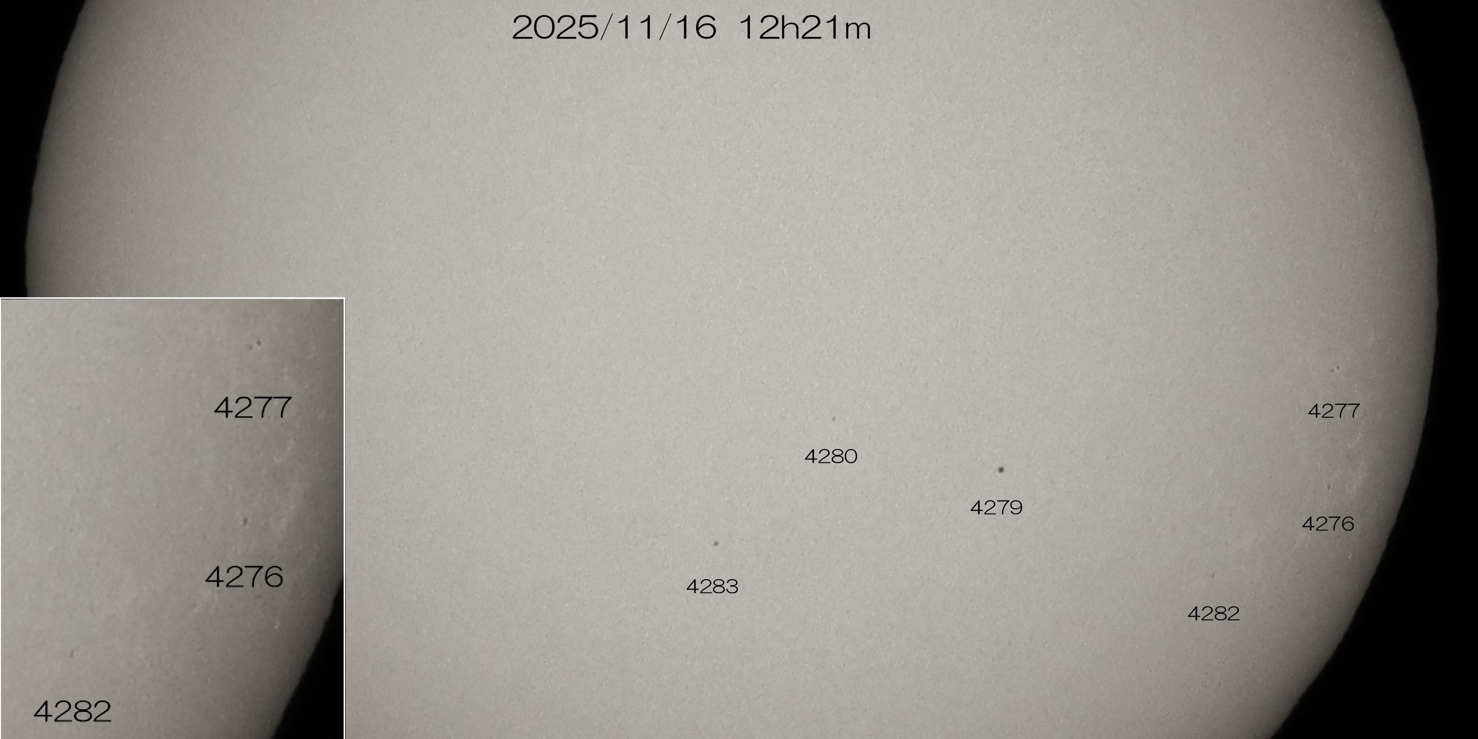大きく目立った黒点群はなくなりました。静穏な太陽面になった印象です。南西端にある小さな3つの黒点群はかろうじて写りました。拡大して左に合成しました。