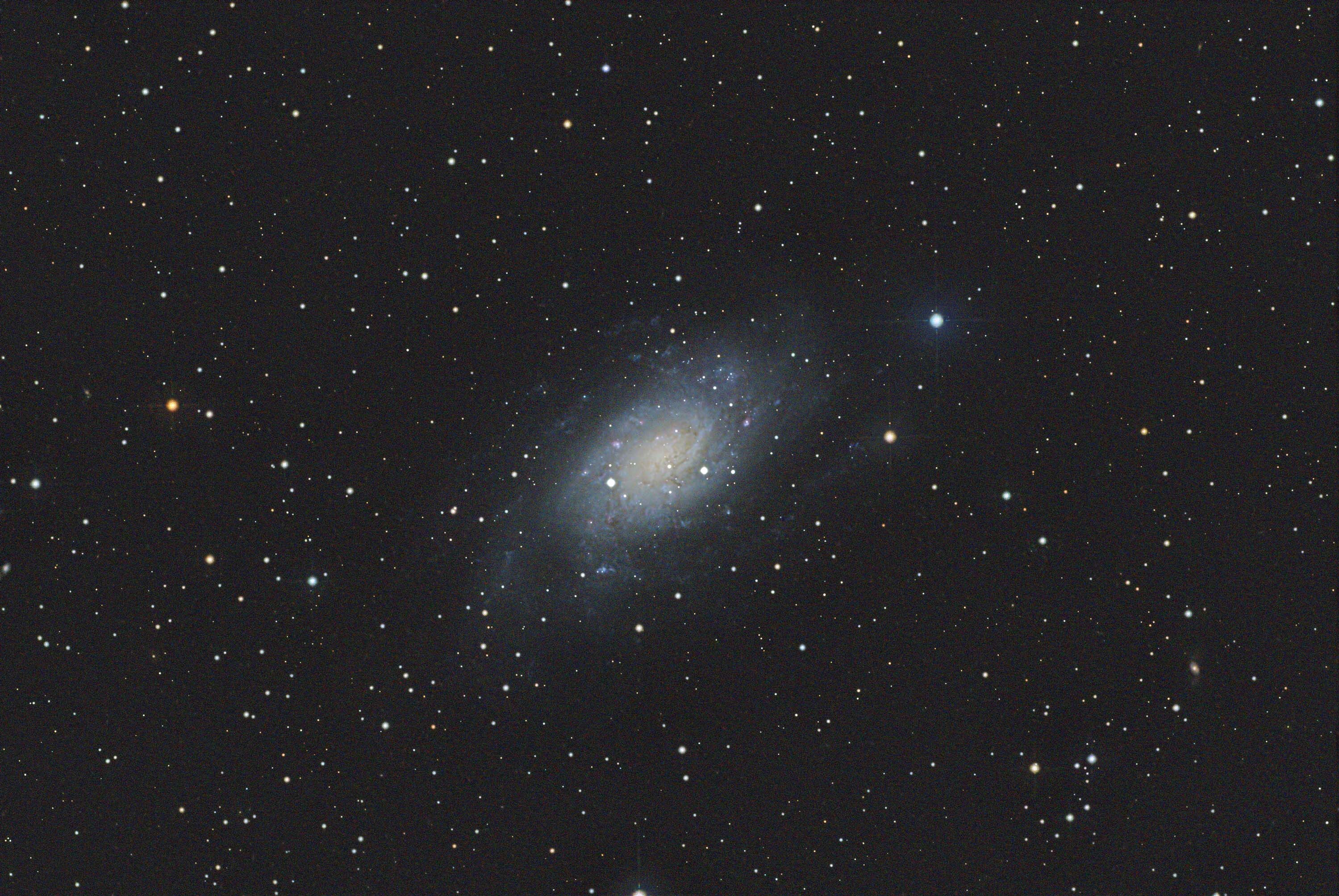 きりん座にある明るくて大きな渦状銀河です。 明け方に再び南からの雲に覆われ始めた中で、北天の晴れ間を狙っての撮影でした。 今までの画像処理では銀河内の構造がはっきりせず見栄えのしない対象でしたが、PixInsightによる画像処理でさんかく座M33銀河に似た腕部の構造や点在するHα領域が見えるようになりました。