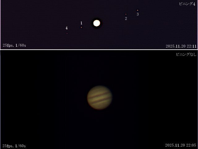 画像に示した条件で撮影した動画から、ビニングなし、ビニング4でそれぞれスタック処理に2606枚、987枚を使ったので、露出に換算するとそれぞれ43.4秒、16.5秒となります。