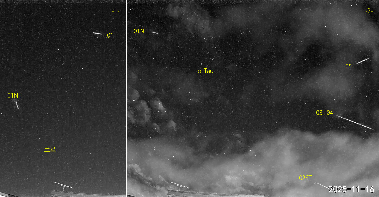 1) 17:42から約2.5時間の2コマを、2) 20:03から約2.5時間の5コマを処理しました。20-22時台は雲が多かった。 出現した順に数字と記号を始点付近に記入。tは痕traceあり。ST:おうし座南流星群、NT:おうし座北流星群、L:しし座流星群