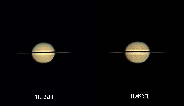 1日前の画像と並べてみました。1日では変化はないですね。準消失まであと2日ですが環は消えず直線的にはっきり見えそうです。