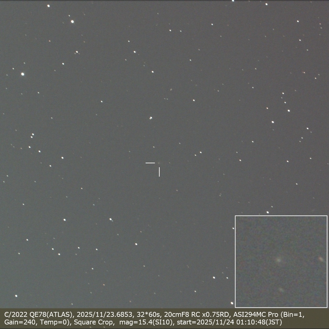 C/2022 QE78(ATLAS), 2025/11/23.6853, 32*60s, 20cmF8 RC x0.75RD, ASI294MC Pro (Bin=1, Gain=240, Temp=0), Square Crop, mag=15.4(SI10)