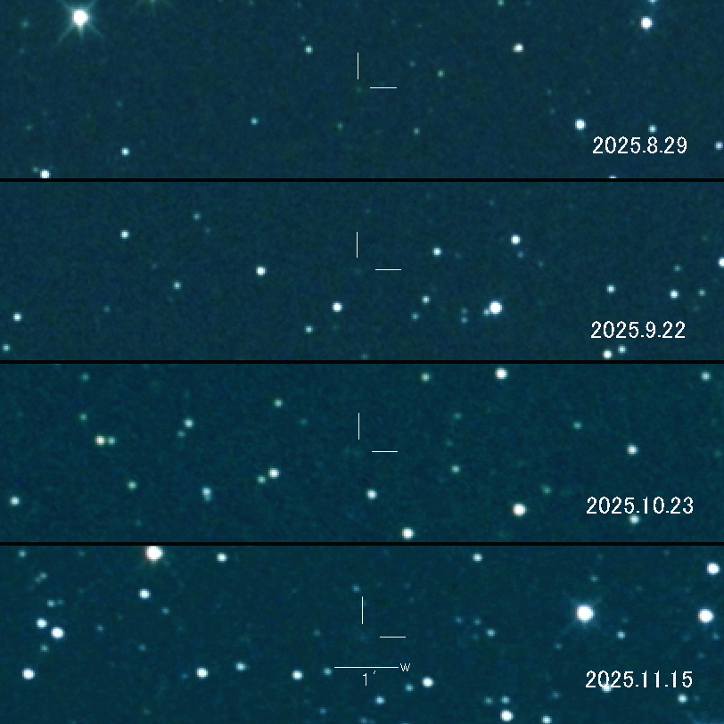 2025.8.29 → 17等級前半 2025.9.22 → 17等級前半 2025.10.23 → 17等級前半 2025.11.15 → 17等級前半 アウトバーストで20等級から増光した後 少しずつ拡散しています。 2028年12月10日が近日点で その頃は16等級という予想です。