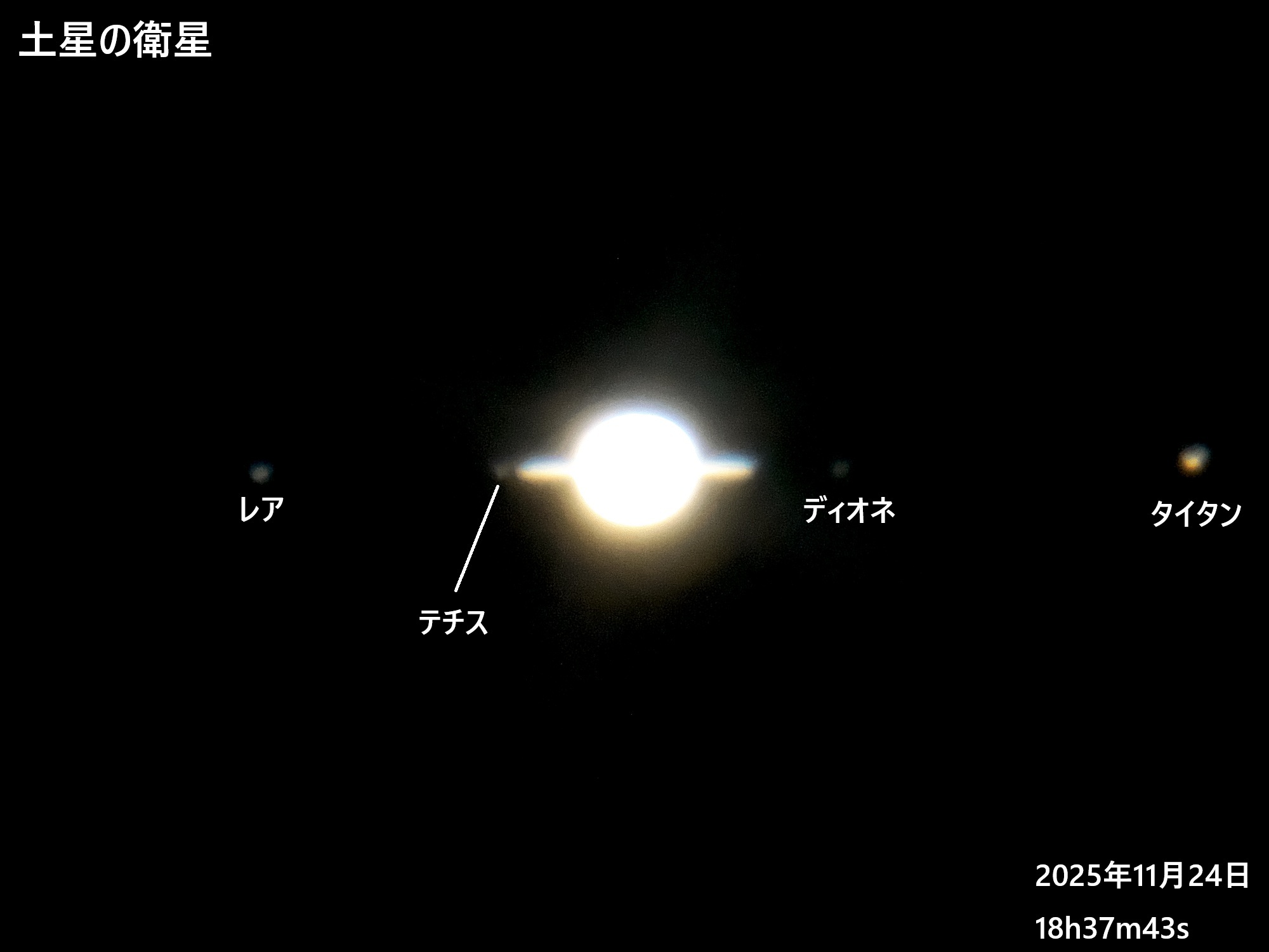 シーイング:3.5/5 透明度:3/5 土星の衛星が木星の衛星のように横一列に並ぶのは普通は目にしないです。 土星の環の準消失日だったのですが露出をかけるとハッキリ見えますね。目でもはっきり見えていました。