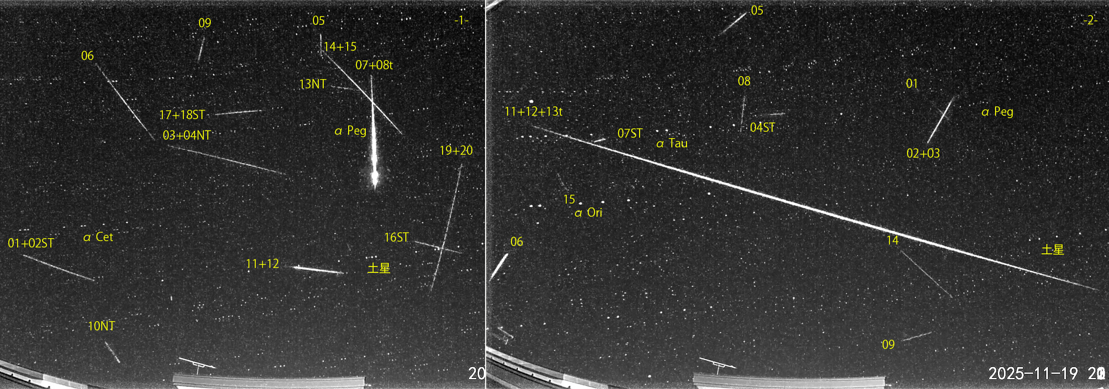 1) 17:23から約3時間の20コマを、2) 20:41から約3時間の15コマを処理しました。夕方から快晴が続きました。 出現した順に数字と記号を始点付近に記入。tは痕traceあり。ST:おうし座南流星群、NT:おうし座北流星群、L:しし座流星群 長々経路の流星が捉えられました。