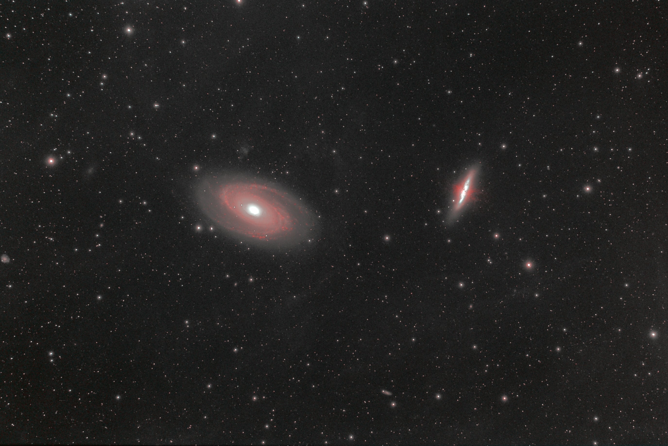 m82の活動領域が見たくて、Hα多めで撮影。結果全体的に赤くなりましたが、ノーフィルターで撮ったデータにうっすら分子雲が写っています。分子雲って、どんな波長で捉えればいいのでしょうか。