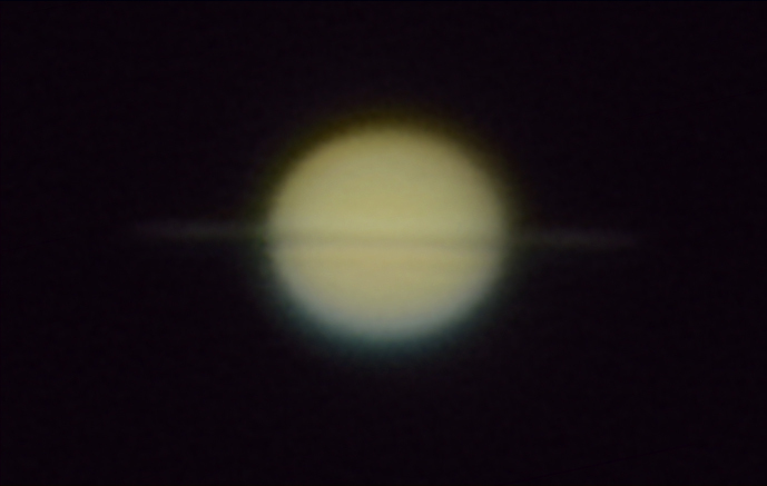 久しぶりの土星の環の消失ですね。消失1日前ですが、糸のように細くなった環は、 眼視では本体に突き刺さった鋭い光線のように見えています。 環の影も黒い線として環のすぐ北側に見えていました(画像は上が南です)。 撮影となると環は光量が少なく難物で、小口径では環の映像を残すのがやっとです。 T=4/5、S=3/5
