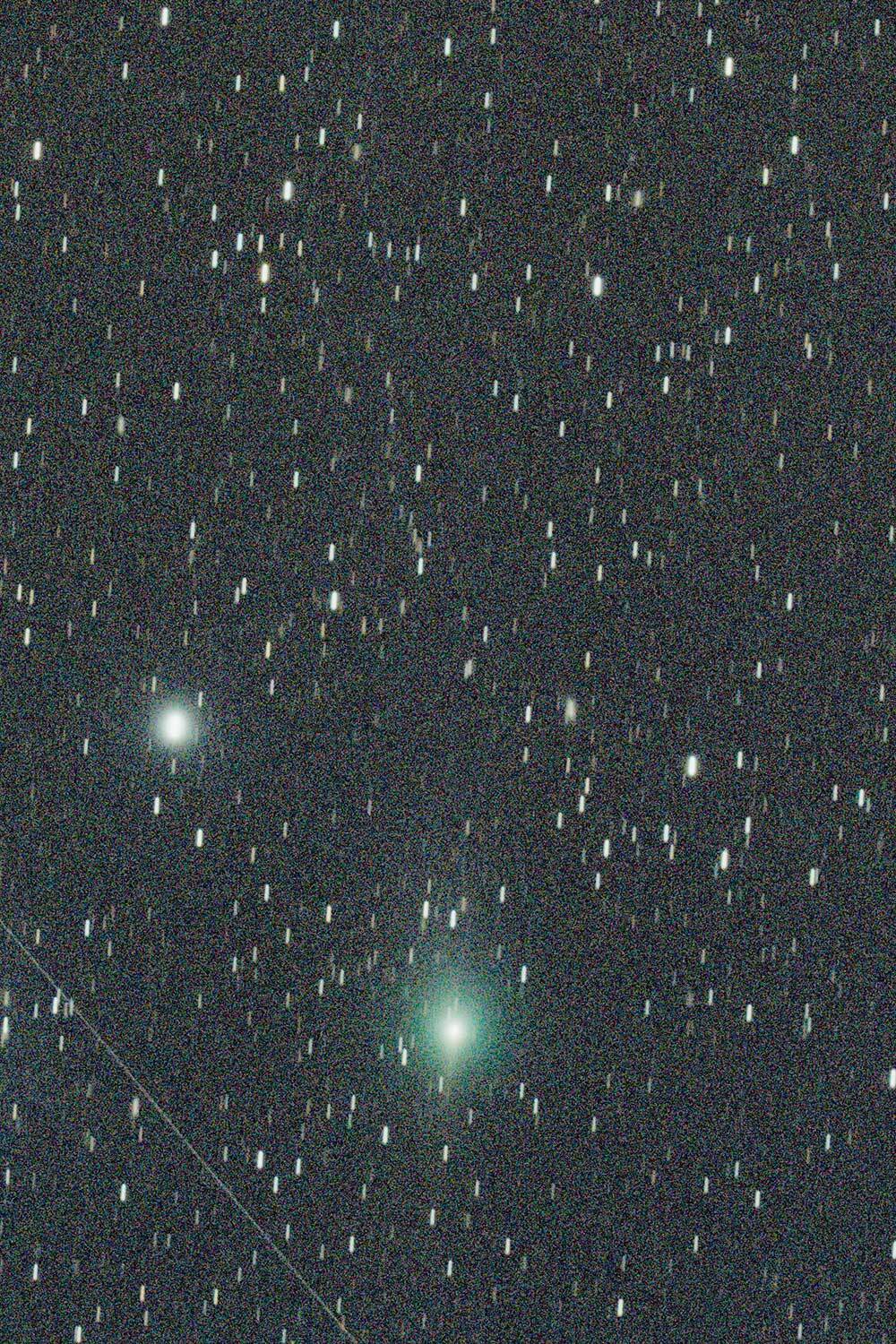 阿蘇車帰で撮影しました。120s9枚から強調しトリミングしています。尾は薄くなり、かろうじて約0.4度写っています。雲の通過を待って撮りましたが、薄雲が広がっていたようで星がにじみました。