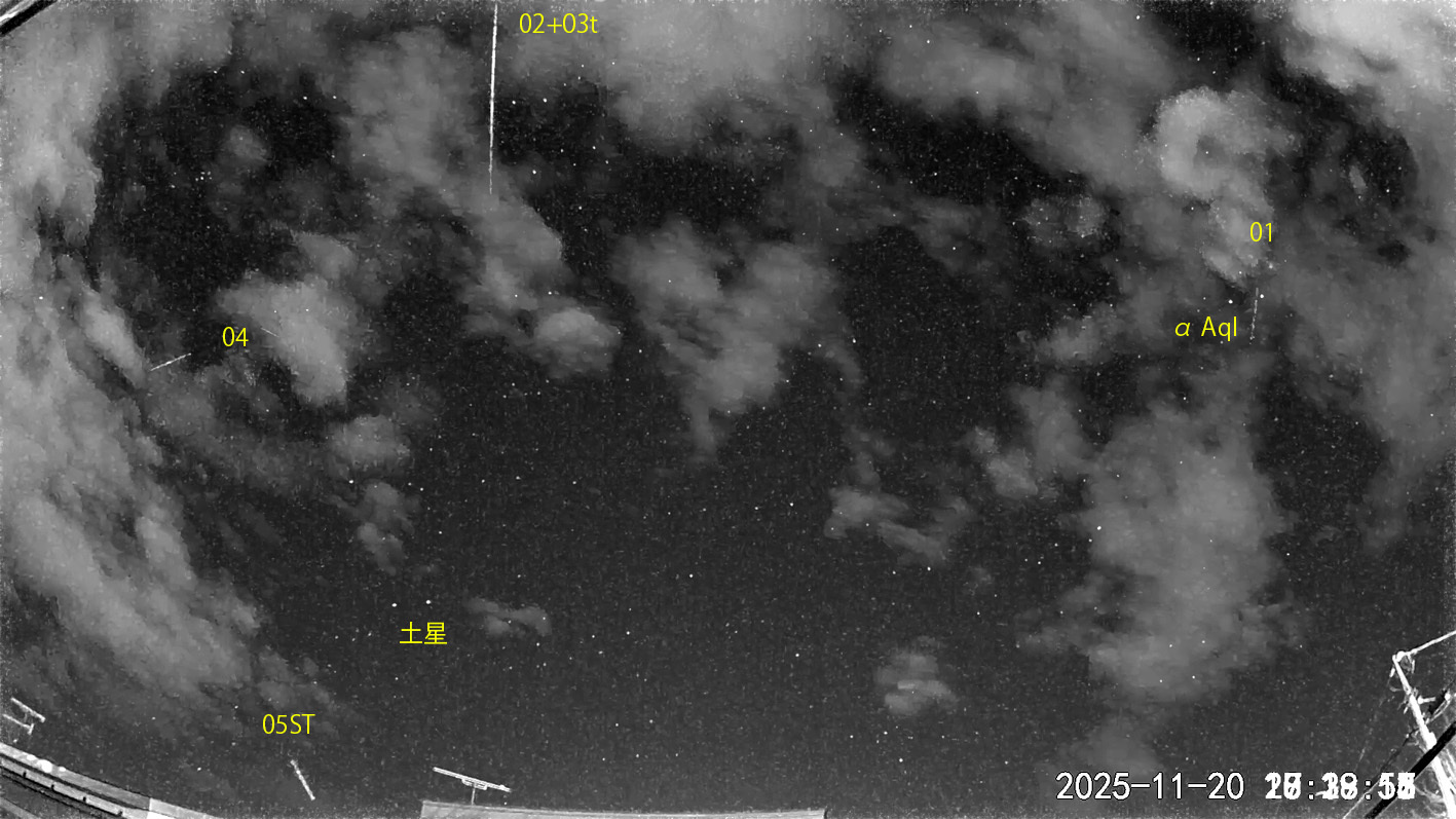 17:19から約1.5時間の5コマを処理しました。 出現した順に数字と記号を始点付近に記入。tは痕traceあり。ST:おうし座南流星群、NT:おうし座北流星群、L:しし座流星群 流れ雲の多い宵でした。日没が早くなったので、17時過ぎから流星が写るようになりました。