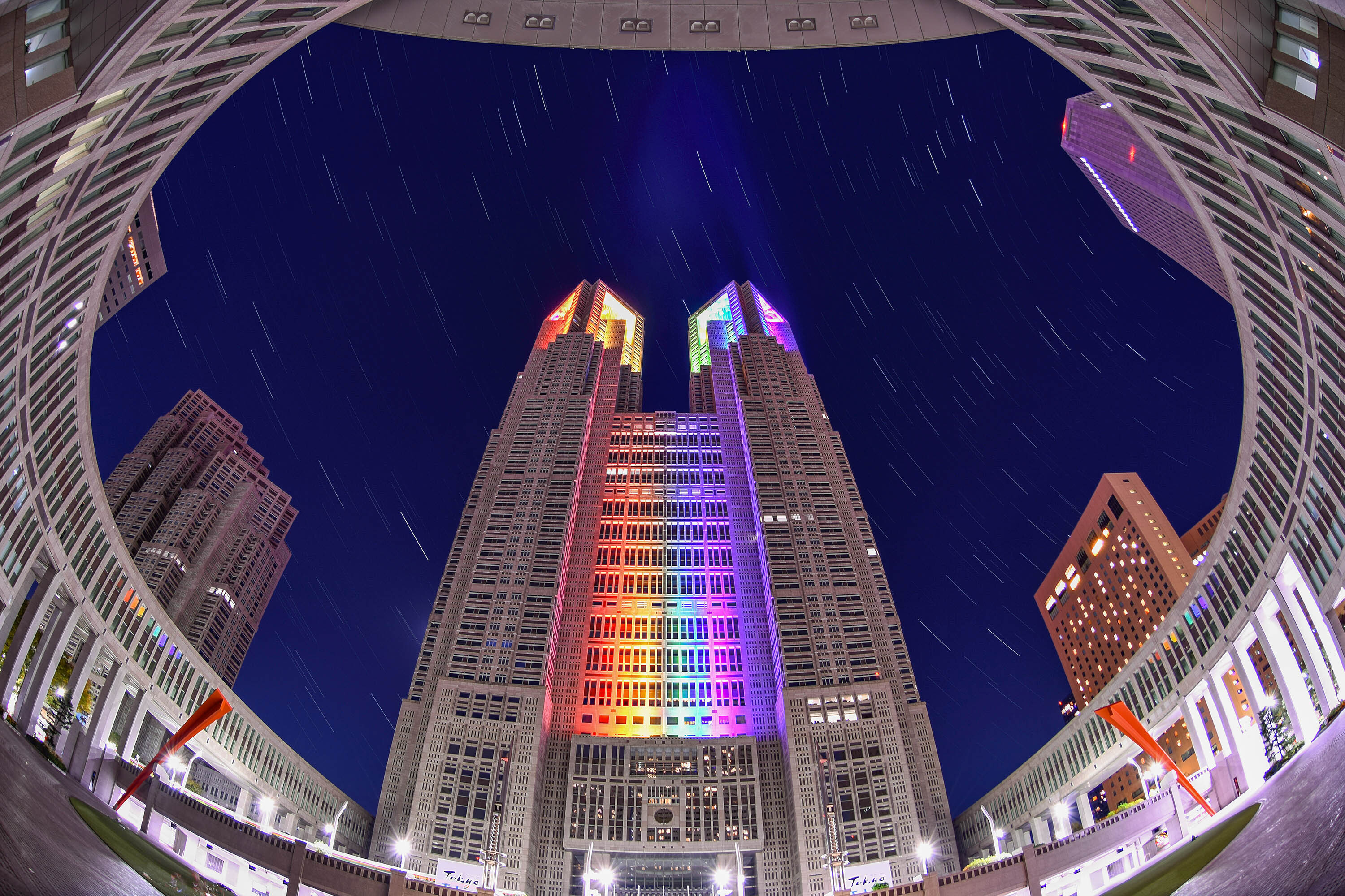11月1日は東京都庁が6色のレインボーカラーでライトアップ。現地に到着時は正面からのアングルに月が入ってしまい、月が入らない #128474 #128502 の撮影後、都庁舎の左後ろに月が隠れてからこのカットを。