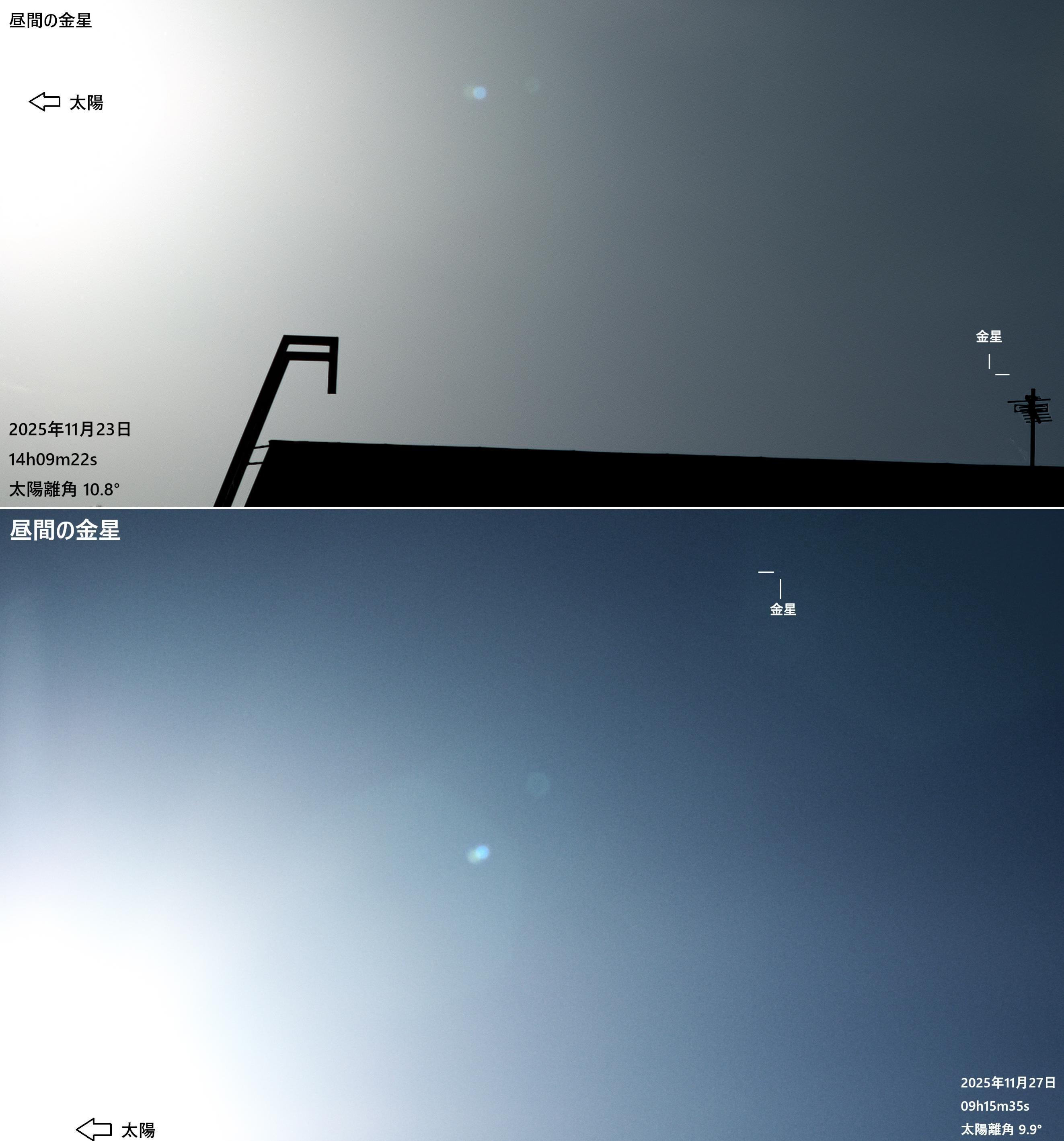 シーイング:不明 透明度:3/5(23日)、3.5~4/5(27日) 外合はもちろん輝面比1.0も天気予報では雪のため無理そうなので、より建設的な望遠レンズで金星を撮影してみました。(太陽の近くなので撮影する方は十分に注意してください。) 一応27日の画像で太陽離角9.9°で画像を見るとあと半分の5°くらいまではこのまま写せるかもしれません(画像処理も必要ですが)。適当なところでフィルターを付けようかなとは思っていますが。