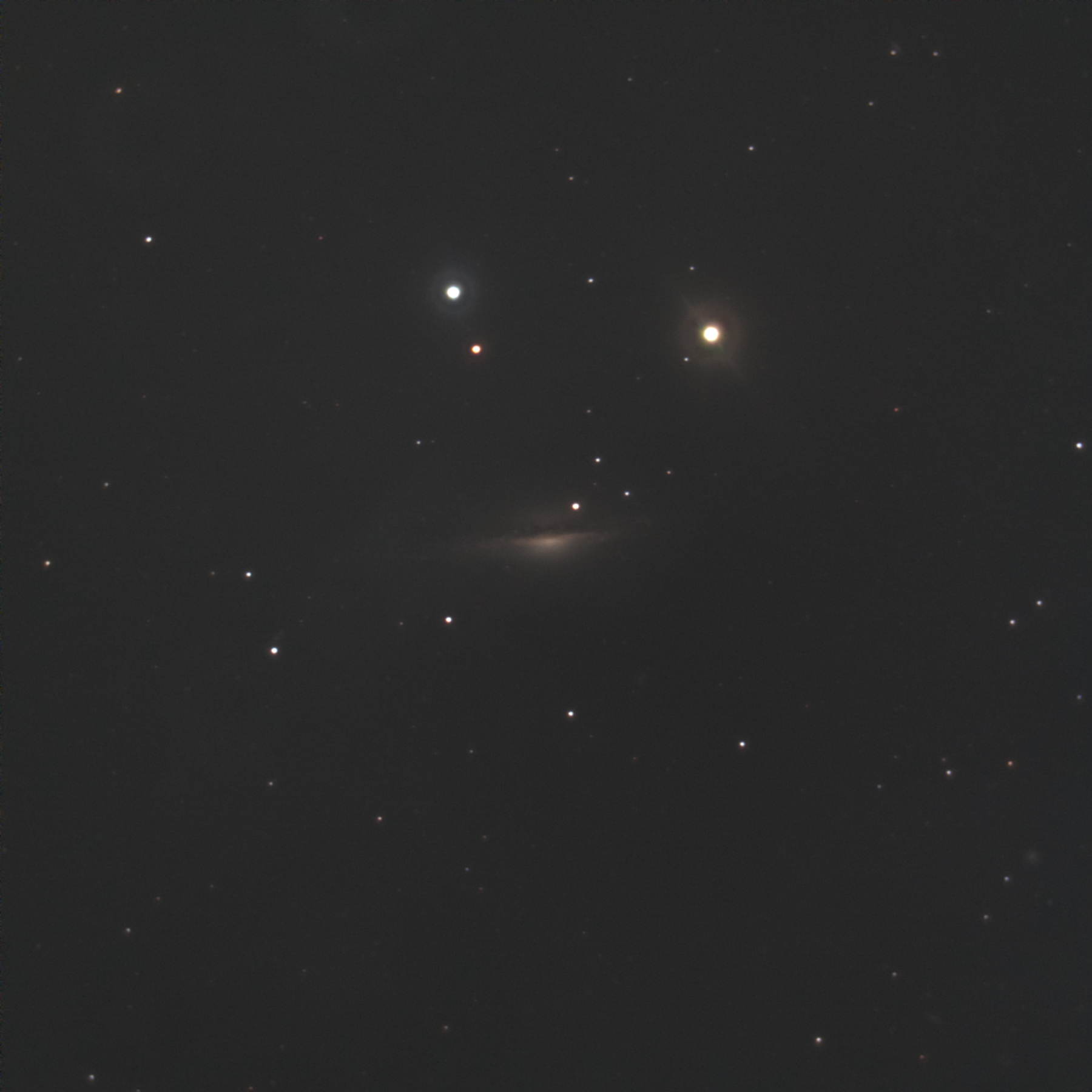くじら座のエッジオン銀河です。M77と同一視野で捉えられることが多いですが、2つの恒星とコラボしてニコニコマークを形成しているのでニコニコマーク銀河と自称しています。明るい恒星の処理と銀河の炙り出しの両立が難しいです。今回も失敗です。