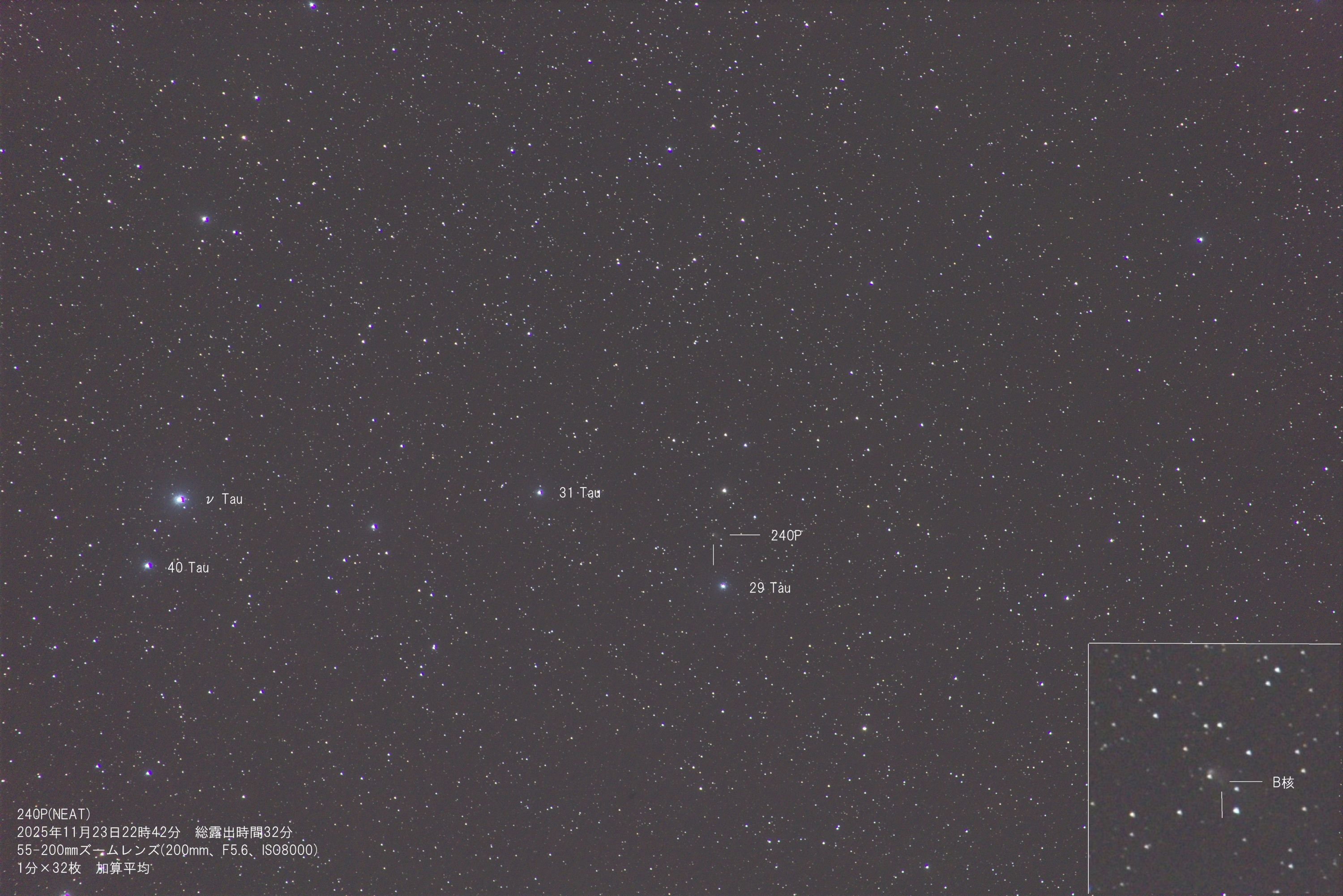 11月23日の240P(NEAT)です。 彗星の右下に分裂したB核が写りました。