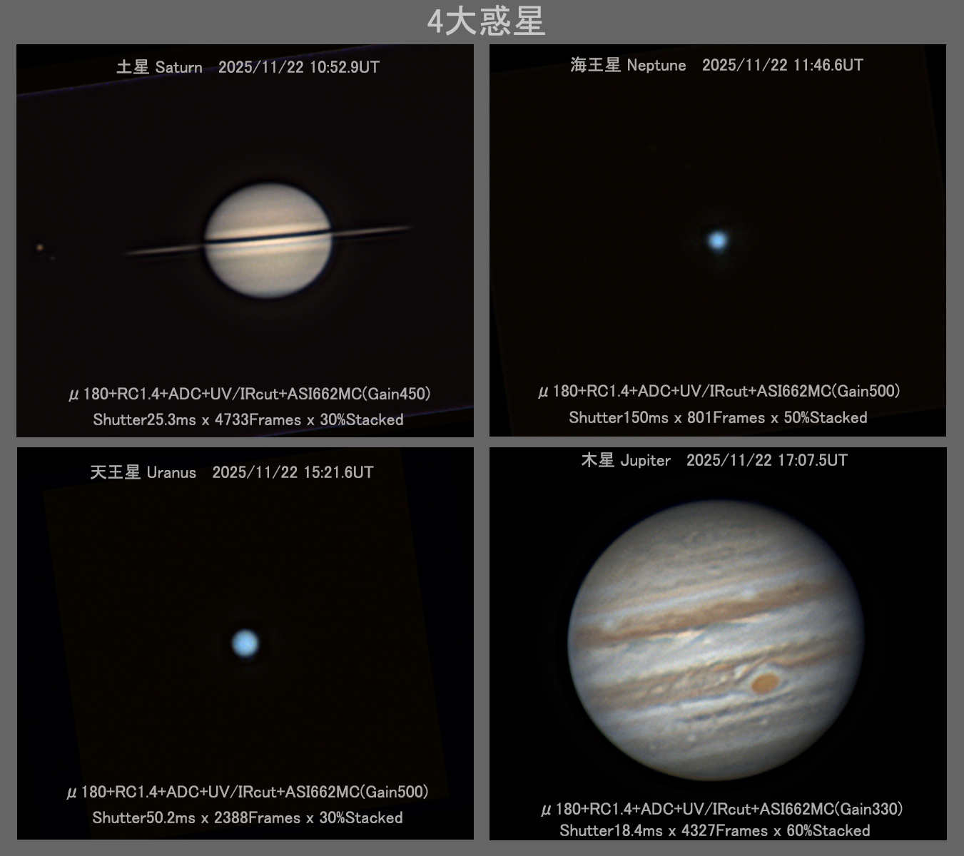 土星は1フレーム露光25.3ミリ秒で4733フレーム撮影。撮影データは画像に記入