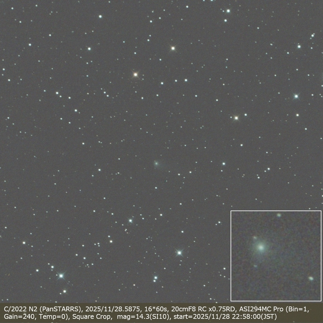 C/2022 N2 (PanSTARRS), 2025/11/28.5875, 16*60s, 20cmF8 RC x0.75RD, ASI294MC Pro (Bin=1, Gain=240, Temp=0), Square Crop, mag=14.3(SI10)