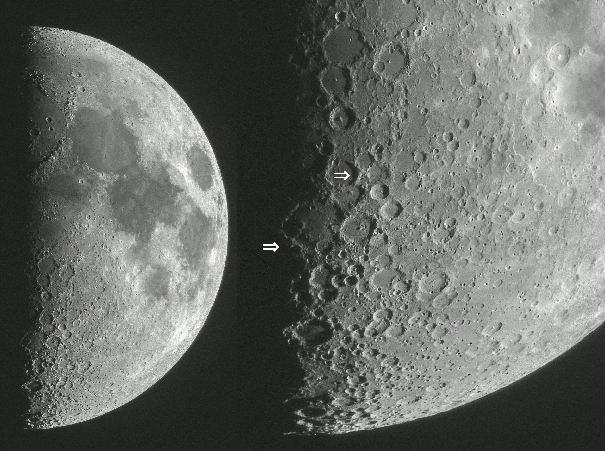 昼間の撮影です。気流が大変荒れていました。(上弦の時刻の30分弱前に撮影、IR800PROフィルター使用)。前日の月面Xは雲で撮れなかったのですが拡大画像の上の⇒のところがXです。下の⇒付近も何かに見えなくもないのですが・・・。