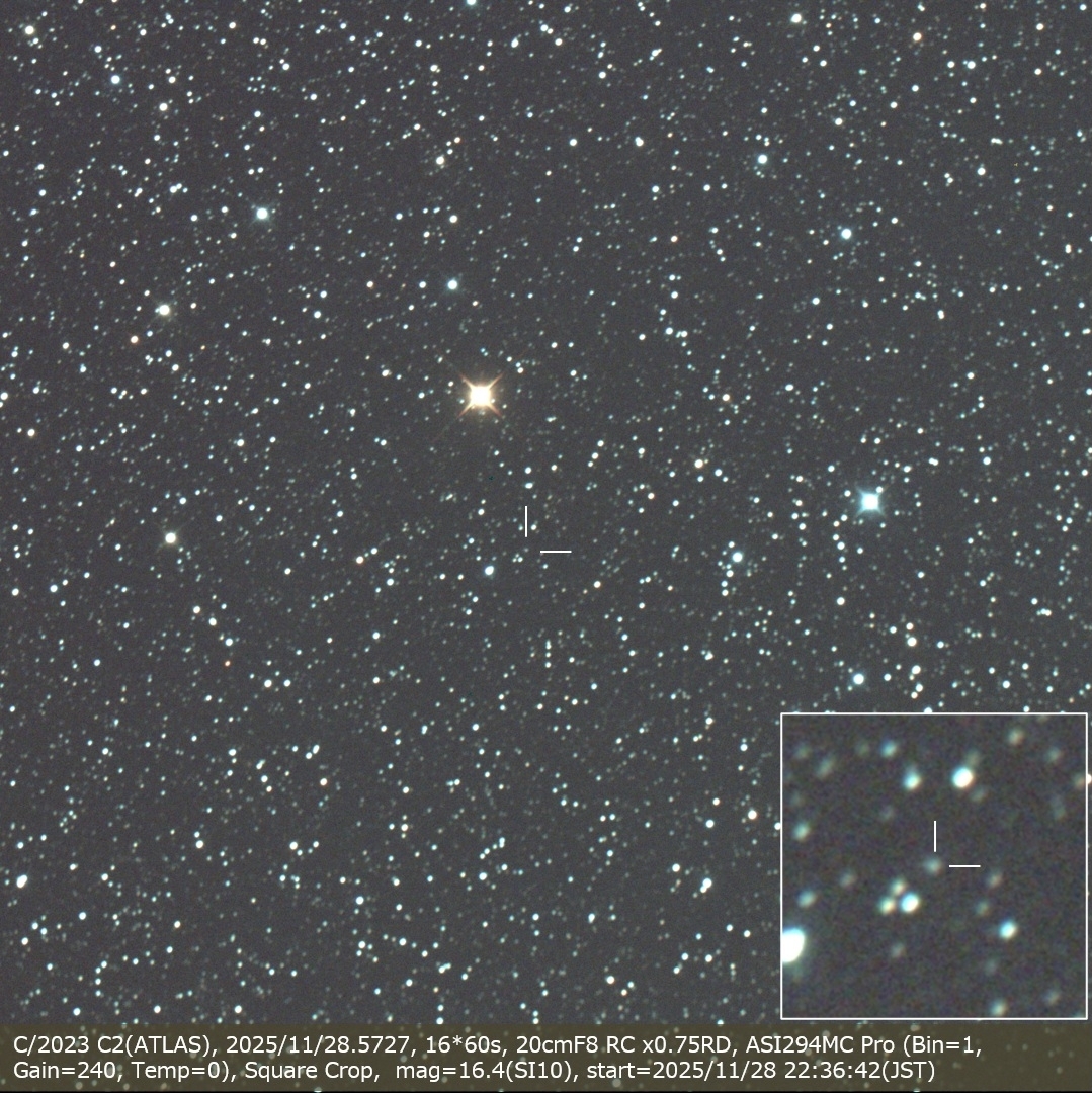 C/2023 C2(ATLAS), 2025/11/28.5727, 16*60s, 20cmF8 RC x0.75RD, ASI294MC Pro (Bin=1, Gain=240, Temp=0), Square Crop, mag=16.4(SI10)