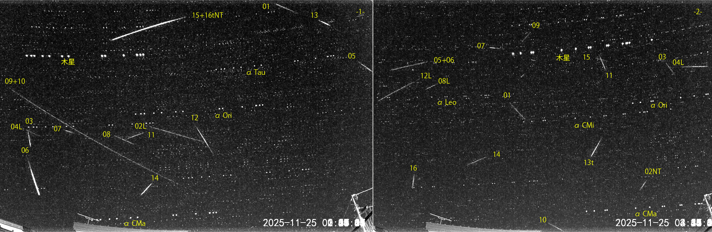 1) 00:20から約2時間の16コマと、2) 02:36から約2.5時間の16コマを処理しました。 出現した順に数字と記号を始点付近に記入。tは痕traceあり。ST:おうし座南流星群、NT:おうし座北流星群、L:しし座流星群 主要流星群の活動も低調です。