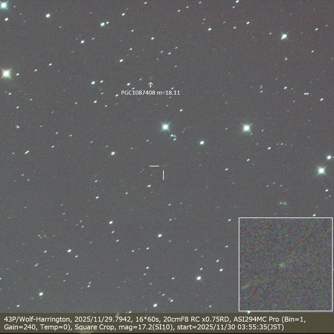 43P/Wolf-Harrington, 2025/11/29.7942, 16*60s, 20cmF8 RC x0.75RD, ASI294MC Pro (Bin=1, Gain=240, Temp=0), Square Crop, mag=17.2(SI10)