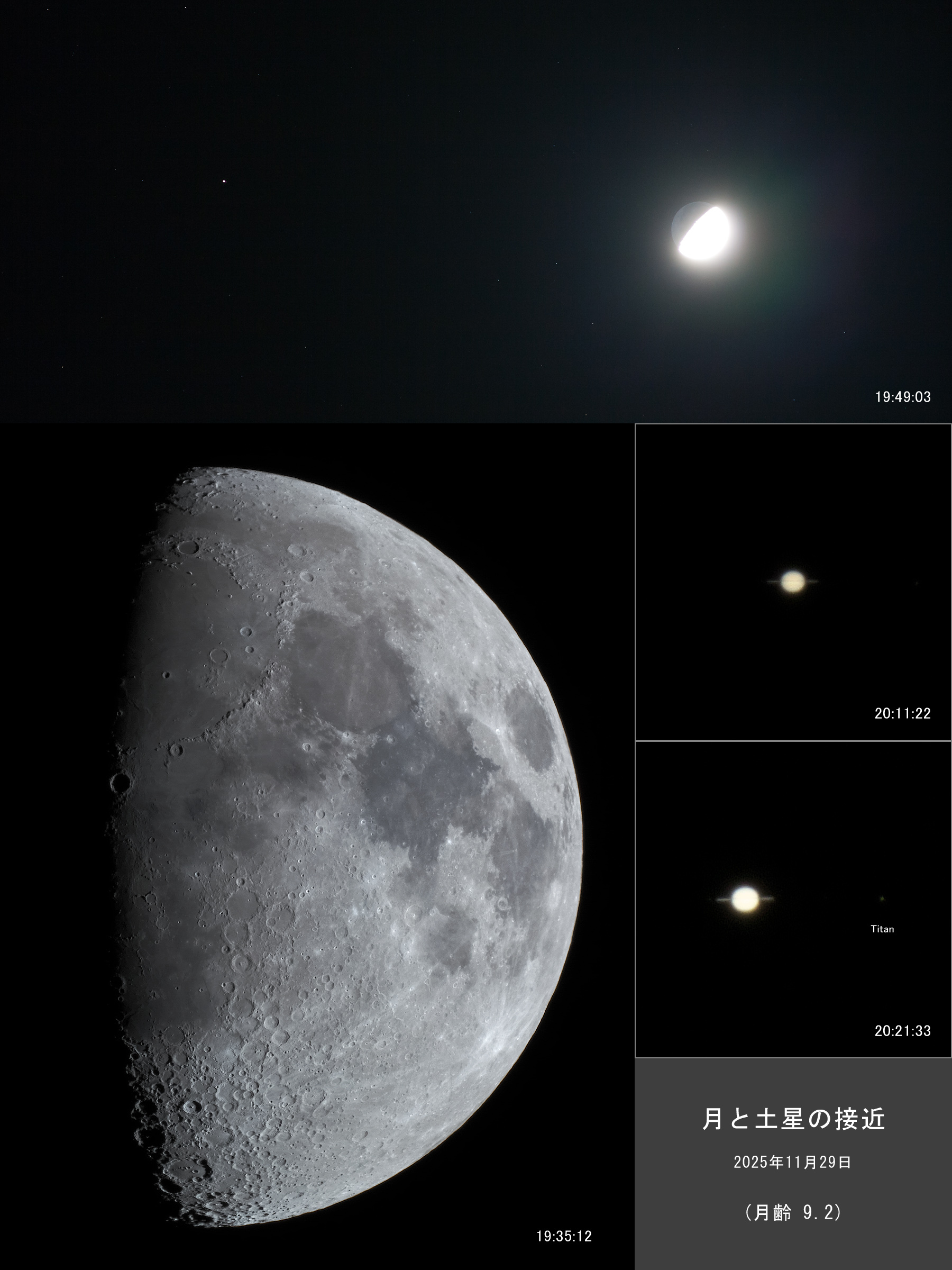 上記は。画面向かって上「月と土星の接近」の撮影データ。左下「月面」のデータ。 ビクセン MC127L(焦点距離 1500mm)Canon EOS Kiss X7i ISO 200 1/80秒 画面右「土星」(左記機材+TELEPLUS HD pro 1500mmx1.4 = 2100mm) ISO 400 0.3秒 画面右「土星と衛星タイタン」 ISO 400 0.8秒  SILKYPIX DS9にてRAW現像。Photoshop CS5にて調整&トリミング&リサイズ。