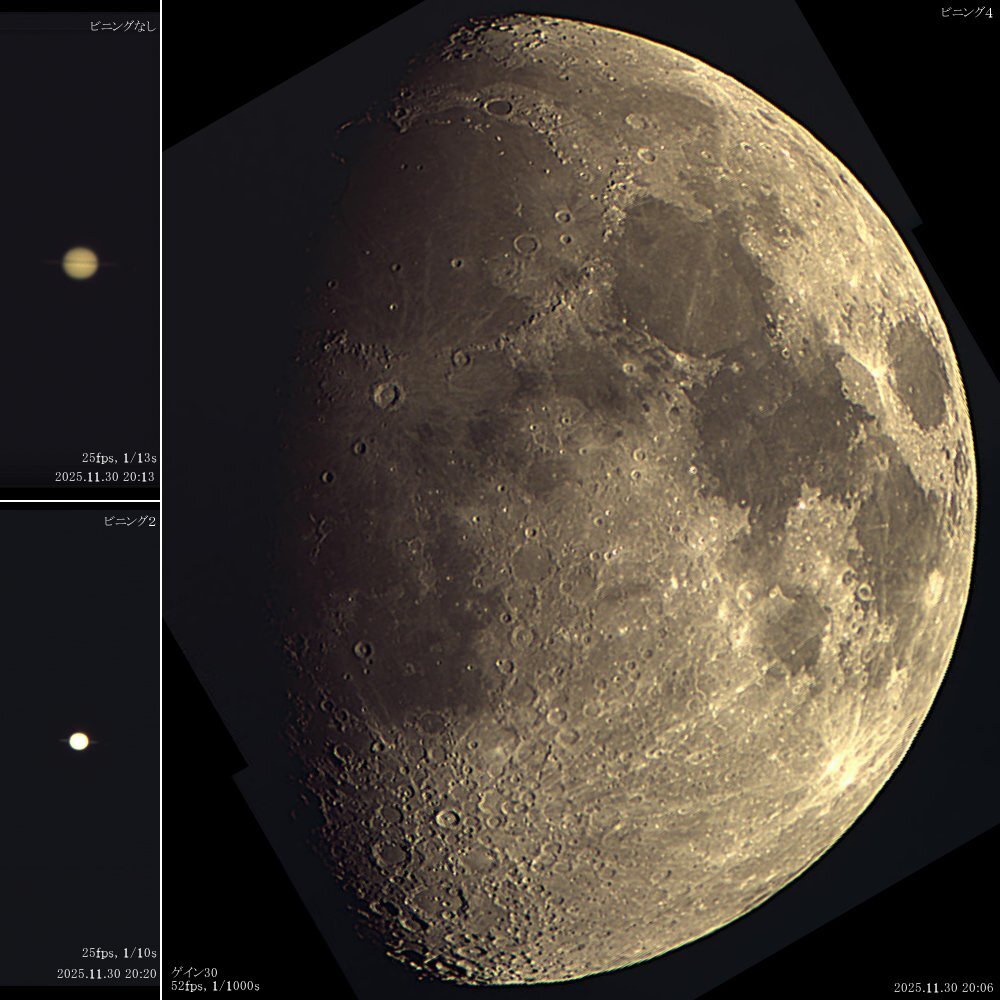 月の全景はビニング4で撮影した動画を6ヶ所で切り出してスタック処理後にモザイク合成をしたもので150フレーム程度を使用しています。土星はビニングなし、ビニング2でそれぞれスタック処理に483枚、159枚を使ったので、露出に換算するとそれぞれ19.3秒、6.4秒となります。
