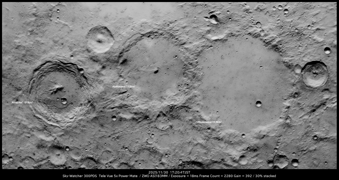 影の少ない月面は白黒反転で地形の凹凸が強調され見やすくなります。