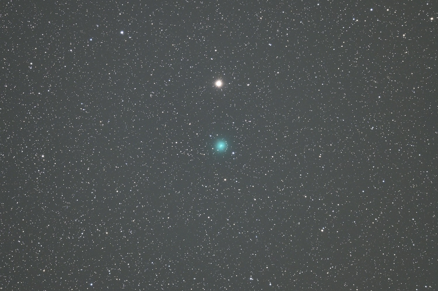 11月22日のアトラス彗星(C/2025 T1)を600mmとで捉え900mm相当にトリミングした画像になります。 9等台後半で映える彗星ではありませんが中央集光が強く、コマのエメラルドグリーンが美しい彗星です・・・。