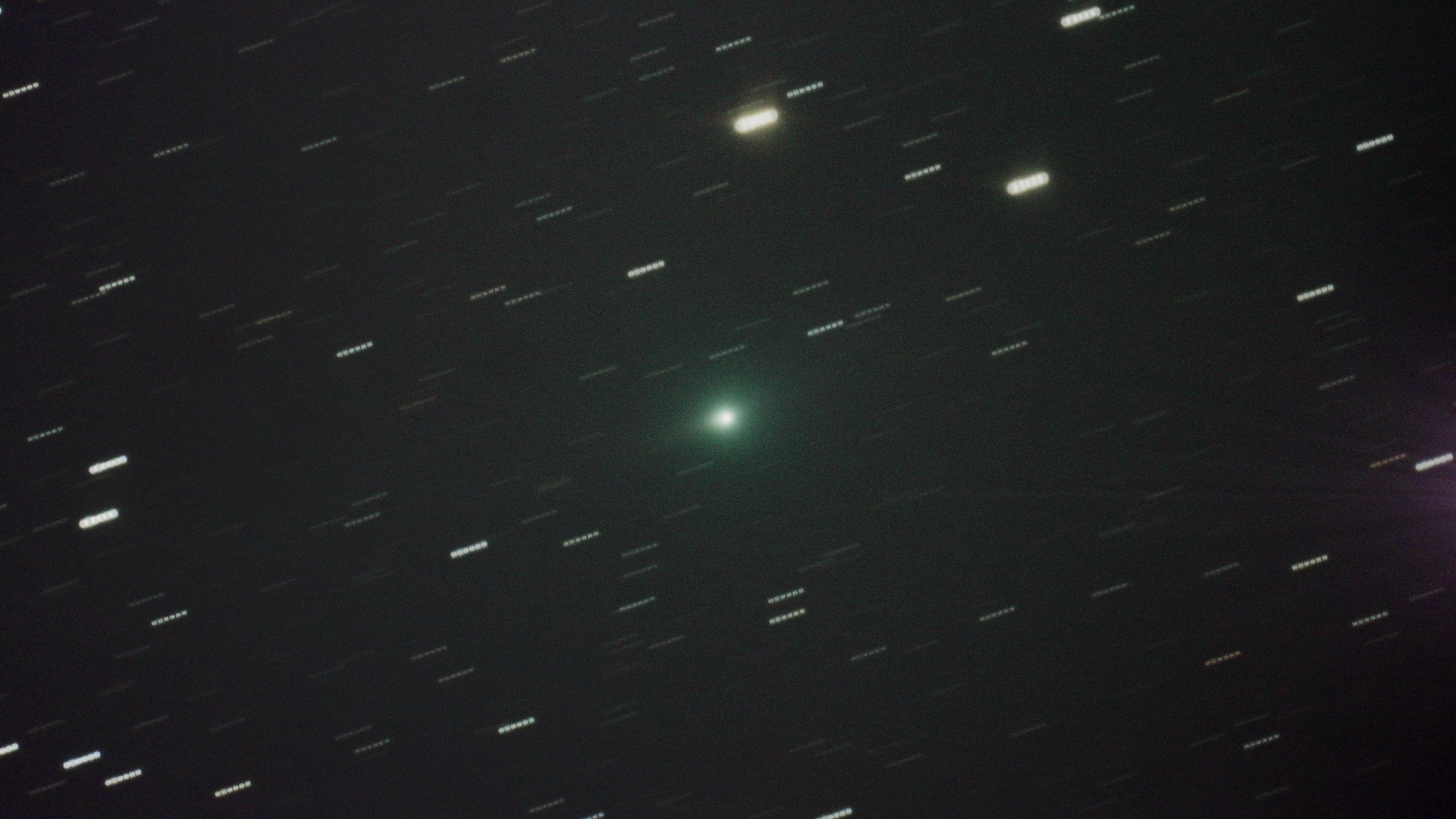 月光の影響の無い中で長めの撮影を考えていたのですが、ようやく総露出時間30分の撮影ができました。 緑のコマが写りました。今後は月光の影響が出てきますが、その前に撮影できました。 彗星の予報光度は10.3等。(ステラナビゲータ12の値) (投稿日:2025/12/03)