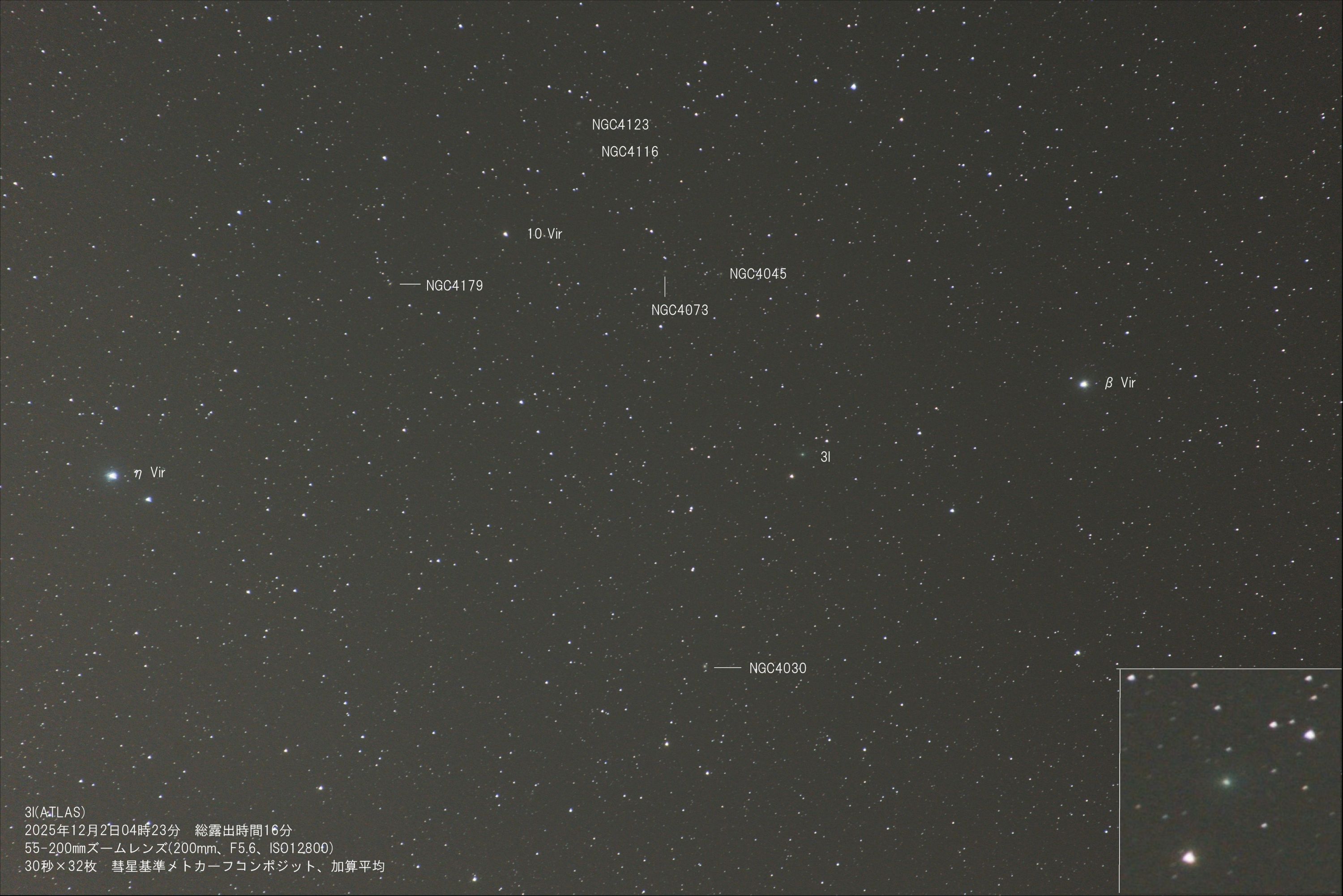 12月2日の3I(ATLAS)です。 8㎝望遠鏡では中心がほぼ恒星状の淡くまるい星雲状でした。 10.5等級、2.5分と目測しました。