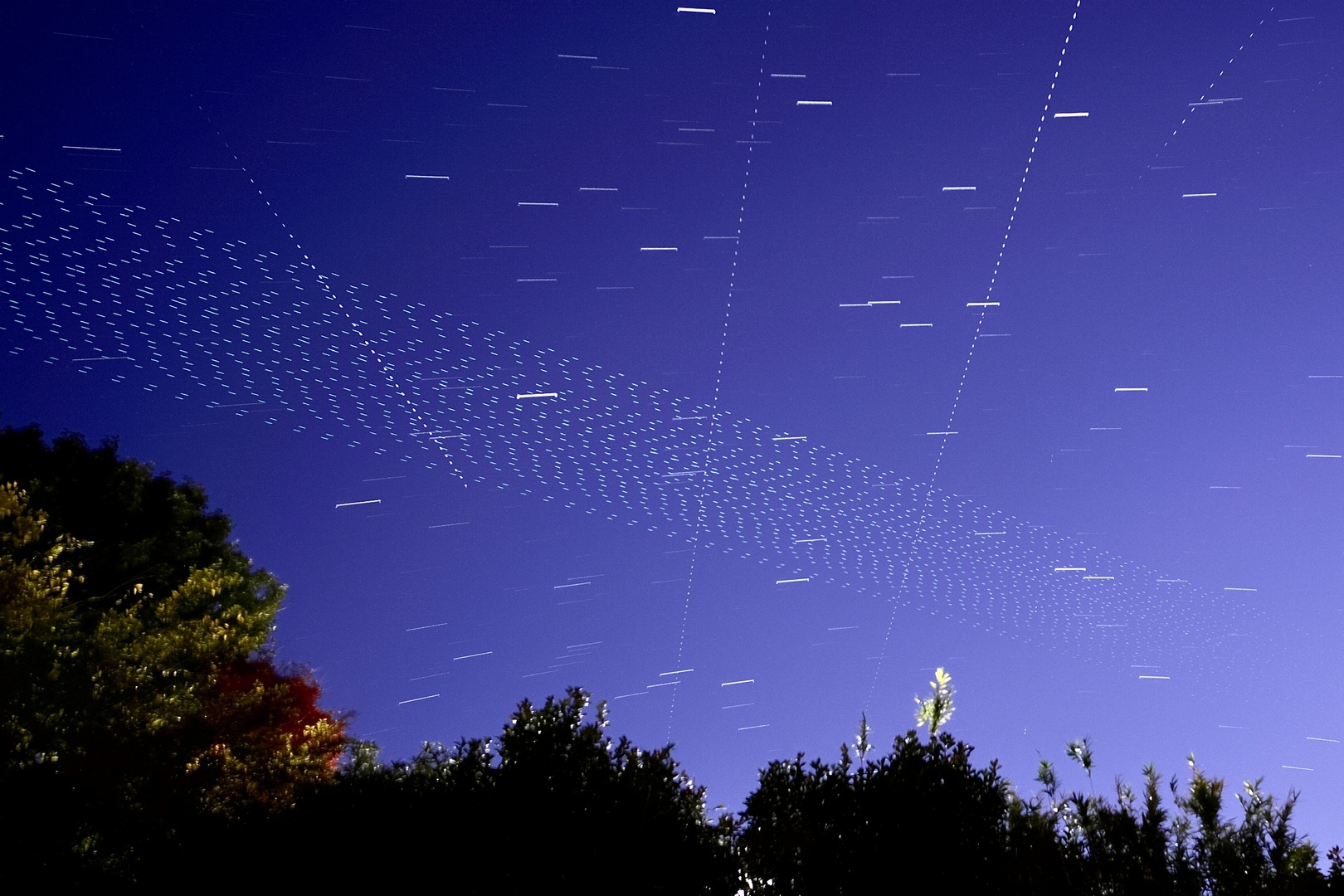スターリンクトレインが通過する時間を調べ7分間(1/4Sインターバル撮影)を比較明合成処理しました。