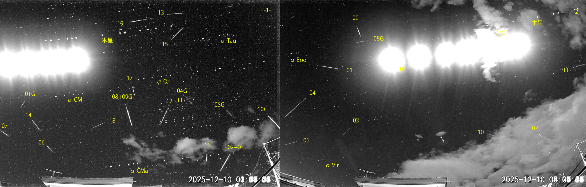 1) 00:21から約3時間の19コマを、2) 03:00から約2.5時間の11コマを処理しました。別画像の月明と重なった流星もあります。 出現した順に数字と記号を始点付近に記入。tは痕traceあり。 【流星群記号】NT:おうし座北流星群、G:ふたご座流星群、M:いっかくじゅう座流星群 05時頃より雲が増えました。ふたご座群は後半の活動が低調でした。