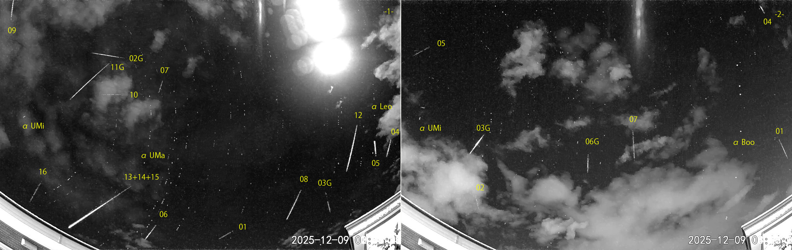 1) 00:13から約2時間の16コマを、2) 03:18から約2時間の7コマを処理しました。04時台に少し雲がありました。 出現した順に数字と記号を始点付近に記入。tは痕traceあり。 【流星群記号】G:ふたご座流星群、M:いっかくじゅう座流星群