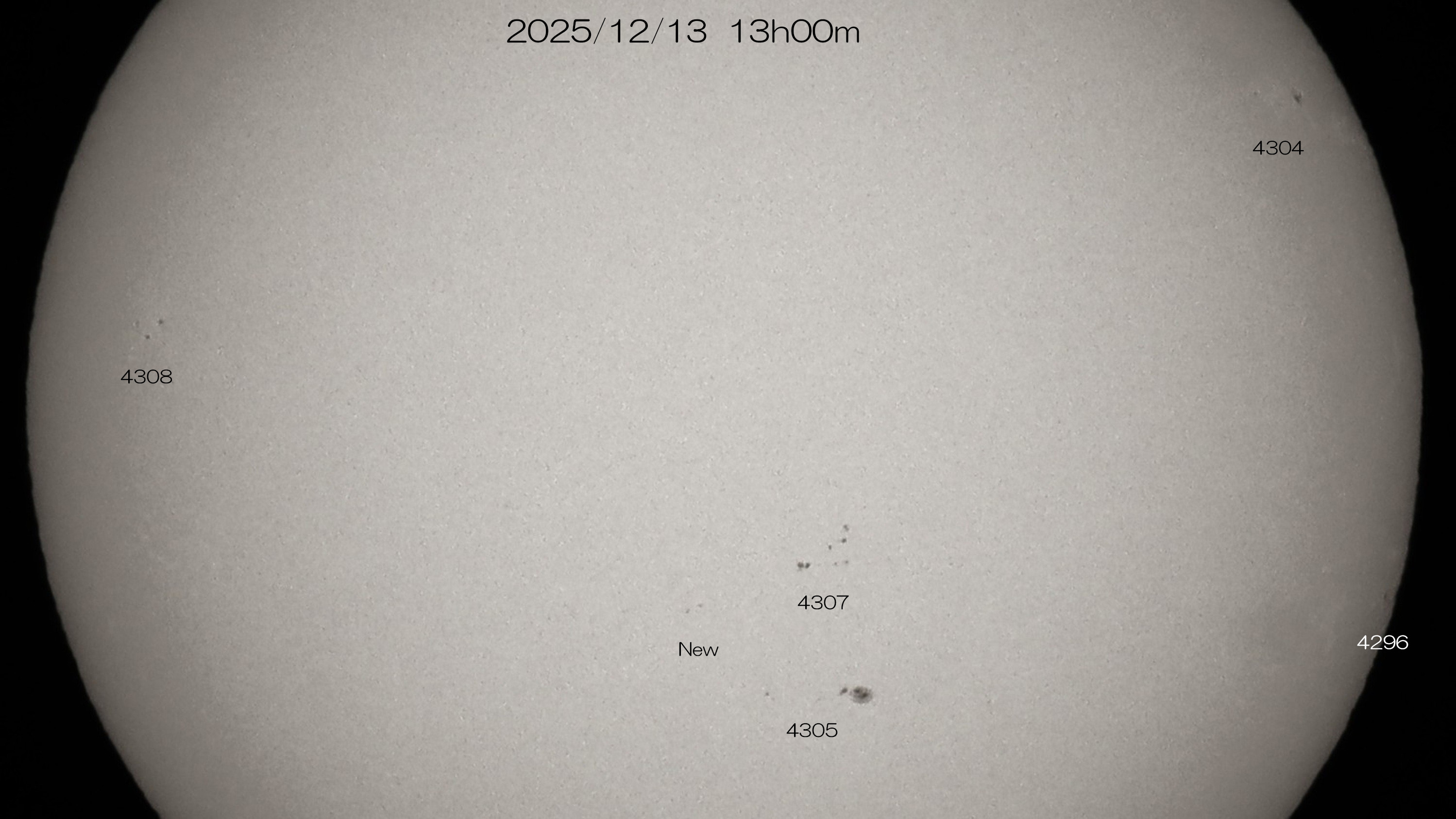 大きかった4296群の端がかろうじて西端に残っていました。昨日東端に現れた小さな新黒点群は4308とつきました。今日は昼頃になって急に晴れ間が広がって撮影できました。