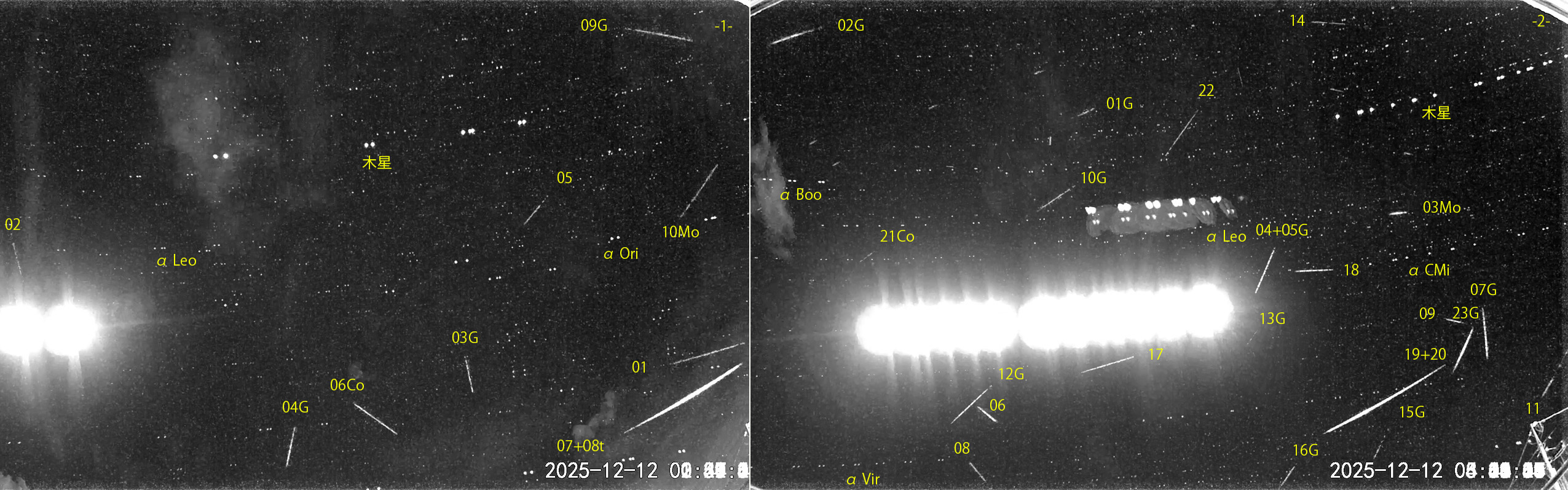 1) 00:29から約2.5時間の10コマを、2) 03:11から約2時間の23コマを処理しました。 出現した順に数字と記号を始点付近に記入。tは痕traceあり。 【流星群記号】G:ふたご座流星群、Mo:いっかくじゅう座流星群、Hy:うみへび座流星群、Co:かみのけ座流星群 ようやく、ふたご座群が活発になりました。極大日は当地では大雪の予報で、見られず残念です。