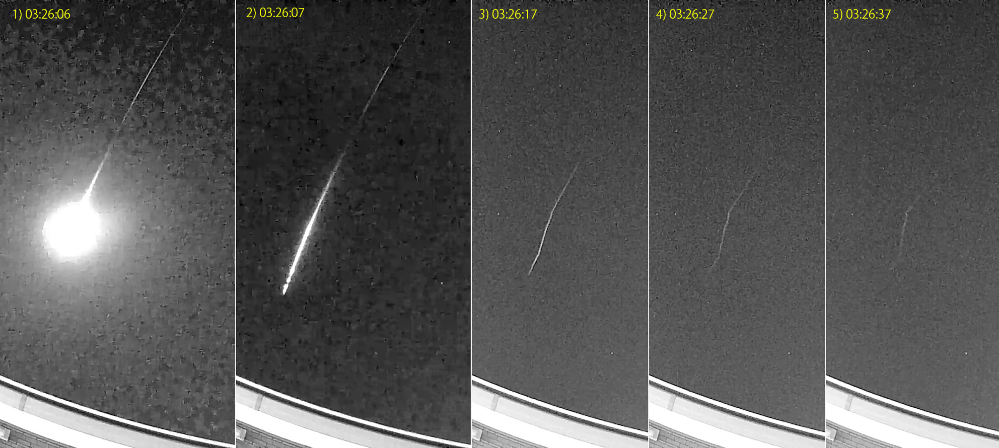03:23:05-03:23:06に出現した火球と永続痕の変化です。永続痕が動画で分単位(この画像は0.5分間)で残ることは珍しいと思います。 目視で見られたら感動ものでしょう。なお、火球の所属が「ふたご座群」かどうかは不明です。