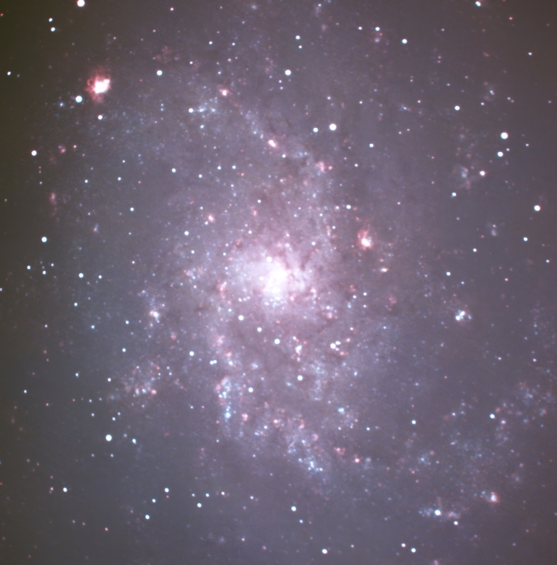 QBPフィルターの使用によりHα領域の分布のようすがはっきりしたようで、腕に沿って点々と連なっているようすがわかりますが、暗黒の塵も点々と連なって、銀河中心で八の字の形で合流しているように見えます。他にもあちこちに暗黒の塵のスジや塊も見えています。そして最大のHα領域であるNGC604からはフィラメントやアーチが飛び出しているようすがわかります。表面輝度も小さく、距離が近い割には眼視では淡く見えずらい銀河なので、穏やかな姿を想像していましたが、かなり活動的なようです。