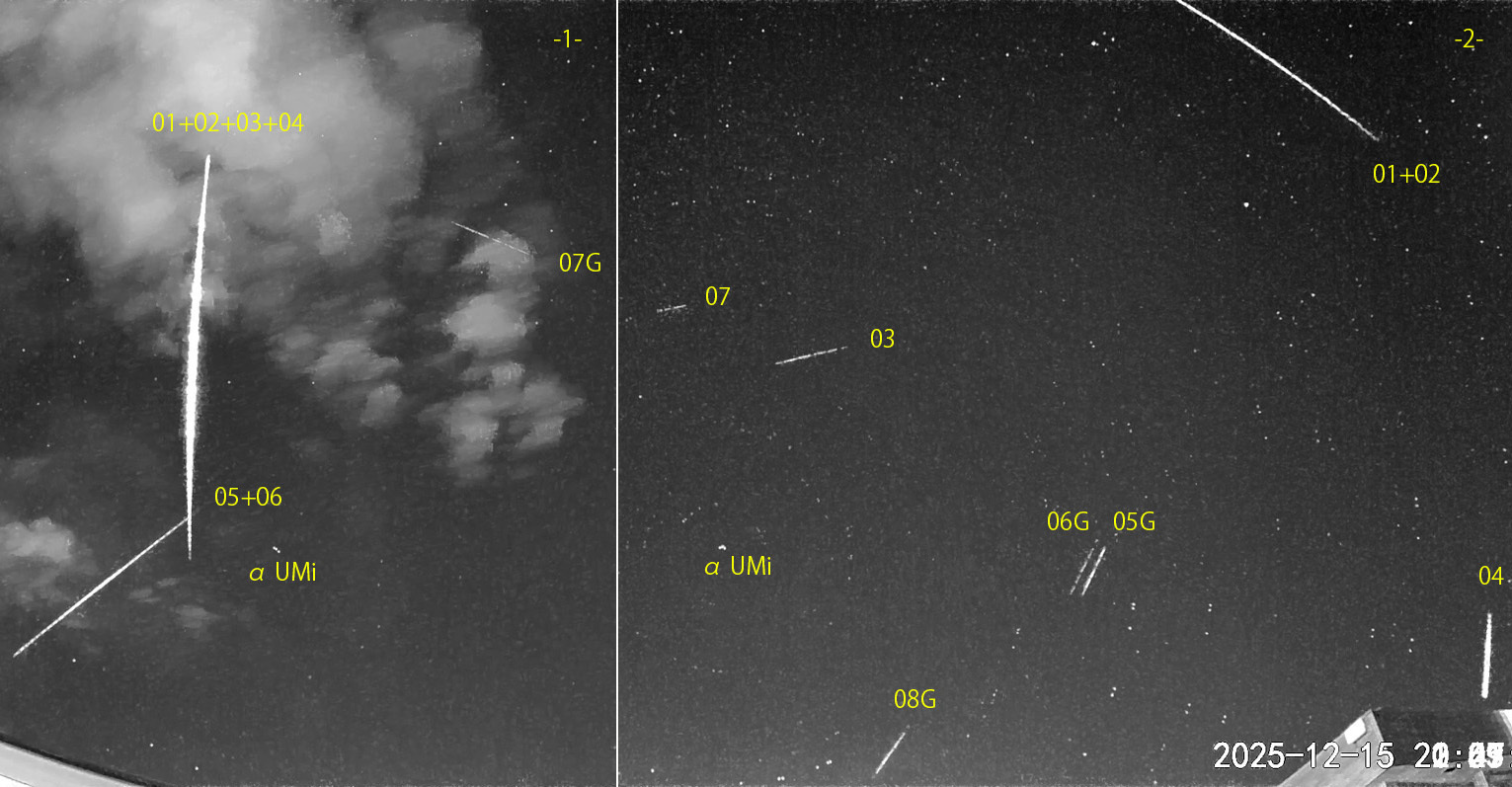 1) 17:14から約2時間の7コマを、2) 20:01から約3時間の8コマを処理しました。 出現した順に数字と記号を始点付近に記入。tは痕traceあり。 【流星群記号】G:ふたご座流星群、Mo:いっかくじゅう座流星群、Hy:うみへび座流星群、Co:かみのけ座流星群 ふたご座群は低調ながら、所属群不明で継続時間の長い火球が捉えられました。