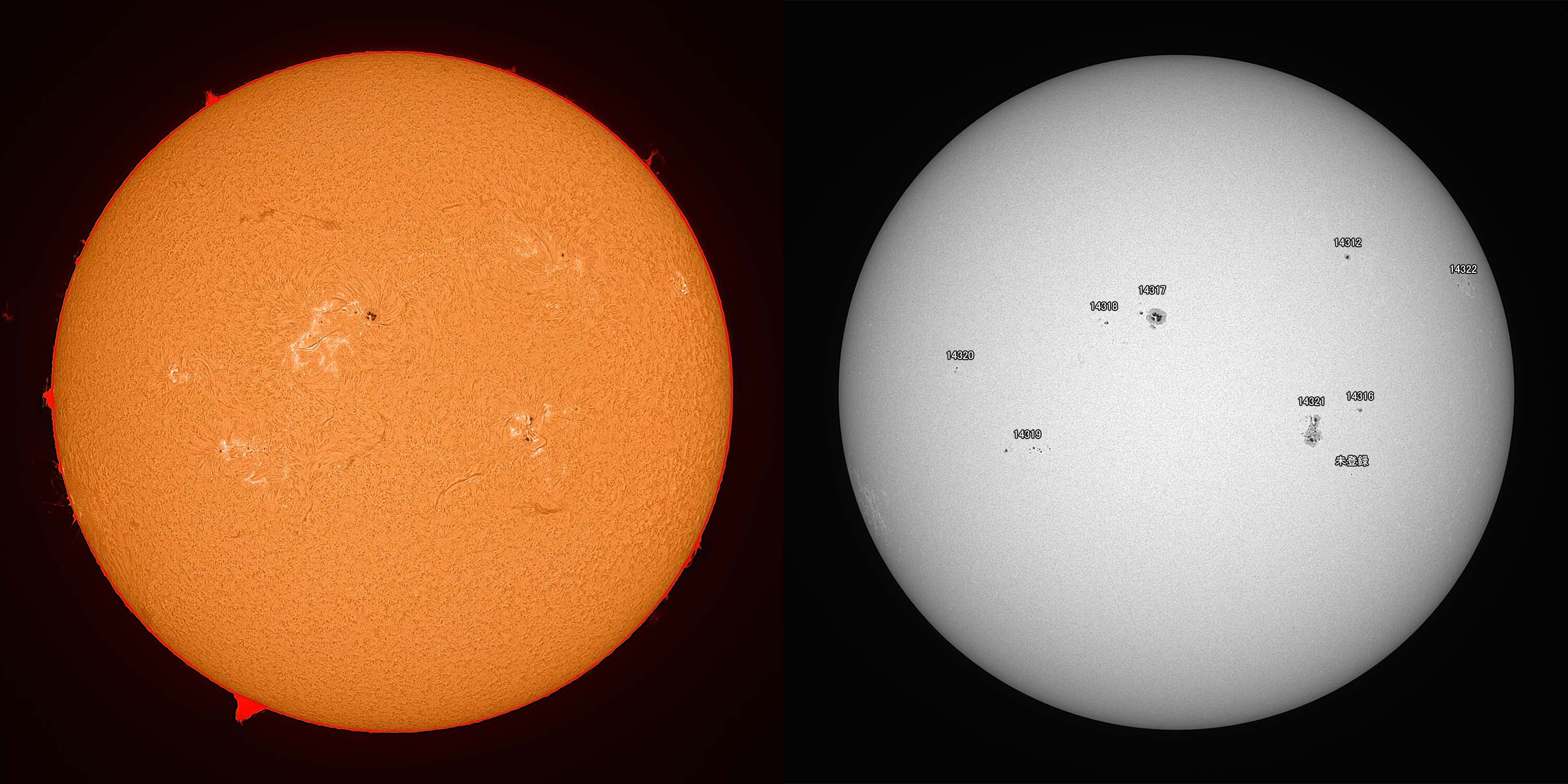光球面:FireCapture、ROI 3600x2400、Gain 100、1.6msec x1000、撮影時間 31秒/プロミネンス:FireCapture、ROI 3600x2400、Gain 300、1.6msec x1000、撮影時間 31秒