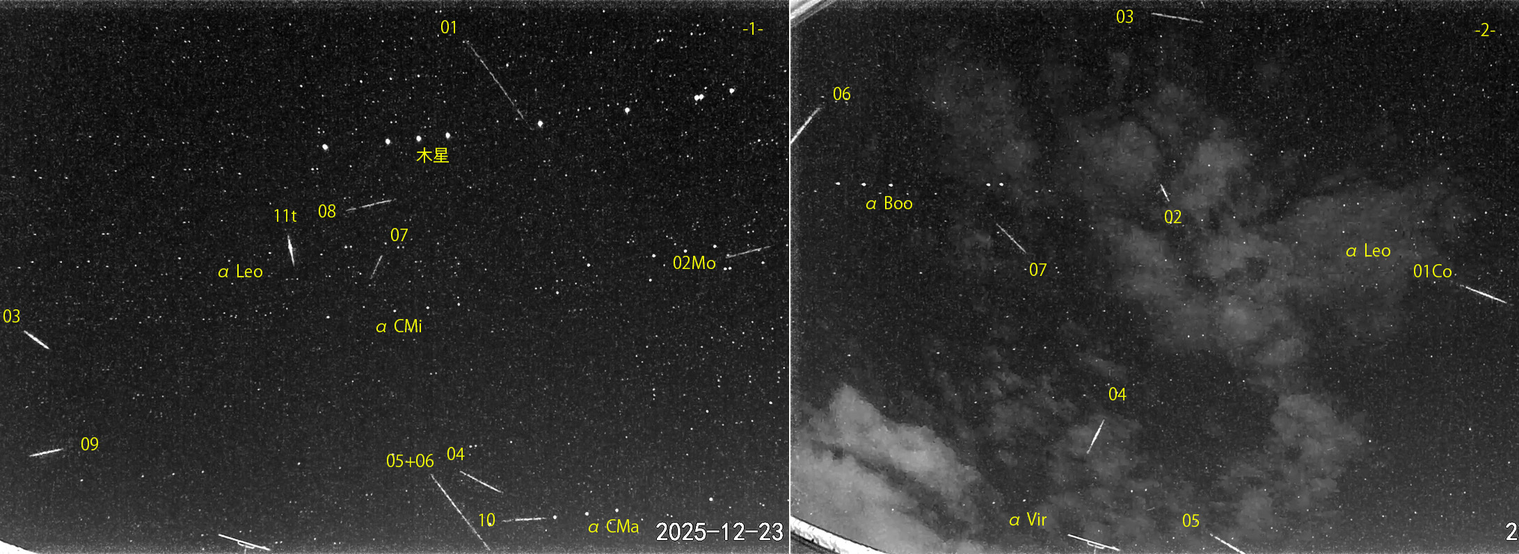1) 00:05から約3時間の11コマを、2) 03:03から約2.5時間の7コマを処理しました。 出現した順に数字と記号を始点付近に記入。tは痕traceあり。 【流星群記号】Mo:いっかくじゅう座流星群、Hy:うみへび座流星群、Co:かみのけ座流星群、U:こぐま座流星群 夕方活発だった、こぐま座群は補足できず。 天候は04時台以外はほぼ快晴で、朝の最低気温はマイナス12.4℃。