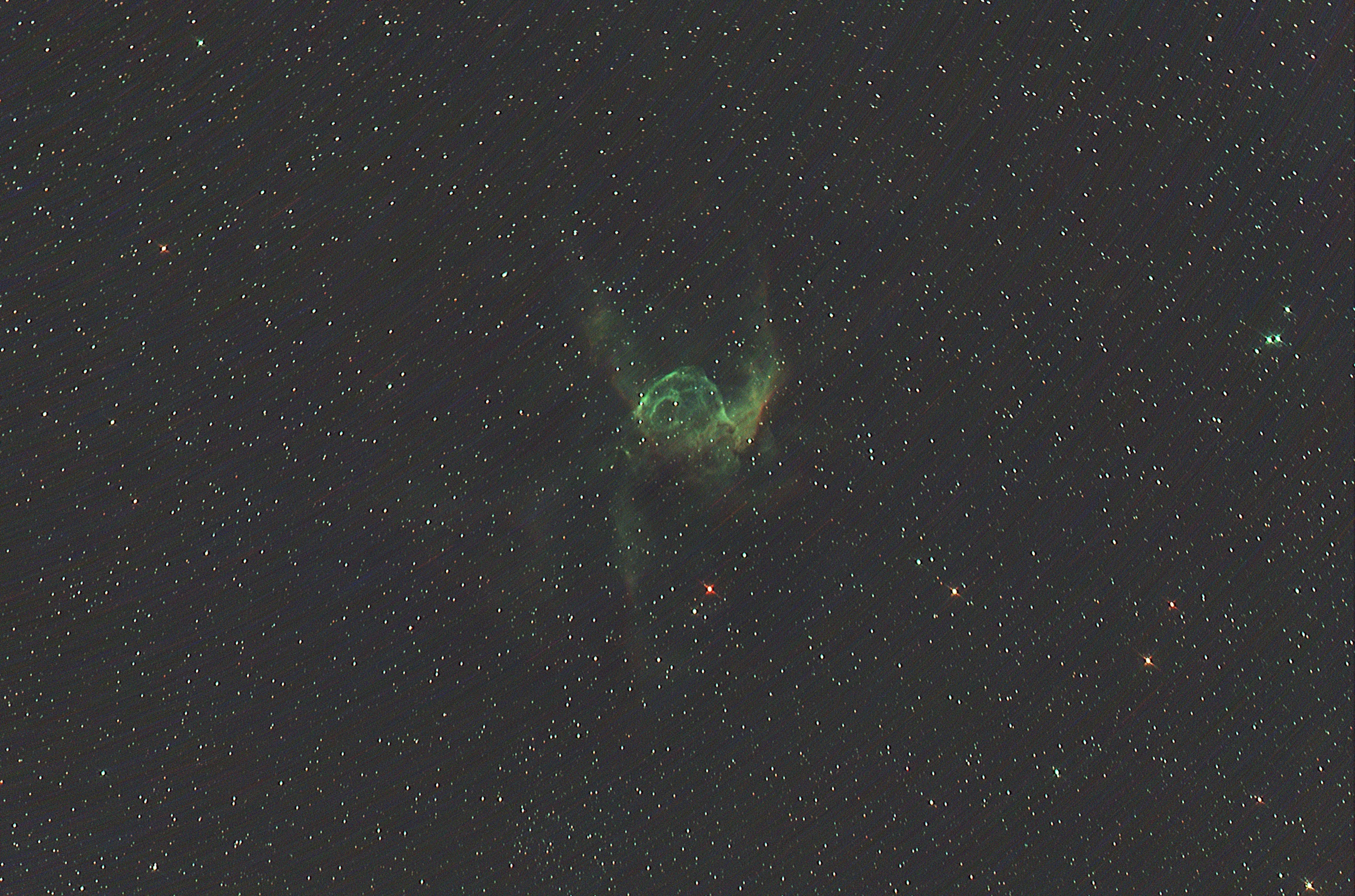 SE200NCR SV405CC CLS Filter gain450 -20℃に冷却 45秒×151=1時間53分15秒 75mmCCTVレンズ+ASI178MM、PHD2でオートガイド DSSでスタック。Sirilで色調補正、バックグラウンド補正、コントラスト調整。 おおいぬ座に位置する散光星雲。中心星はウォルフ・ライエ星と言われる超新星となる前段階の極端に高温の巨星とされています。上弦の月が西空にありましたが、デュアルナローバンドフィルターの使用で淡い部分まで撮影することができました。