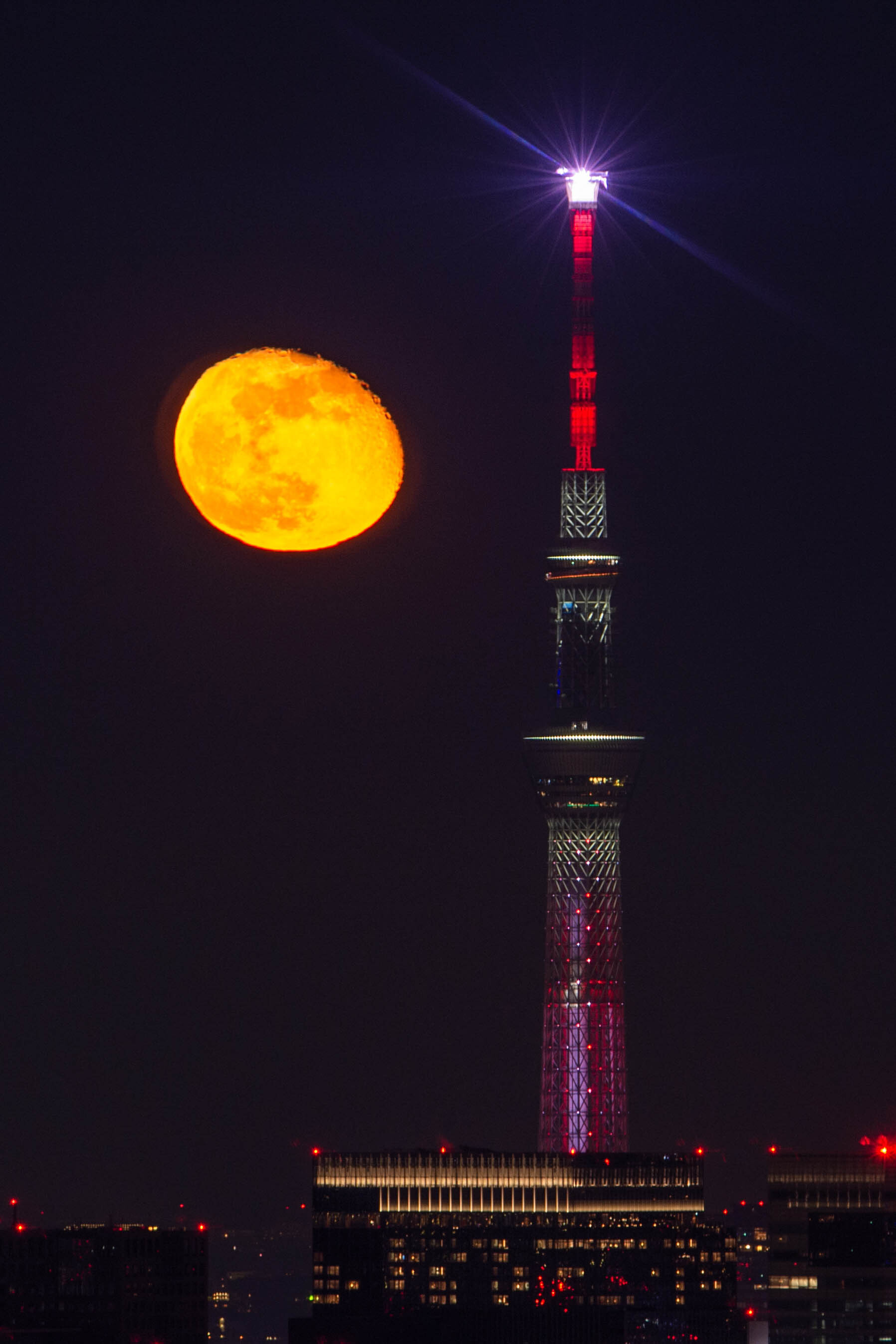 天体山望で調べた東京スカイツリーすぐ近くから月の昇る日。 過去の経験で、ここ渋谷スカイのガラス窓越しはどうしてもゴーストが出てしまいます。が、周りの人に聞くと、出ていない人も。 ガラスの位置によっては出ないそう。質は均一のハズですが。研究課題です。 私もゴーストの少ない位置を探し出し撮影。