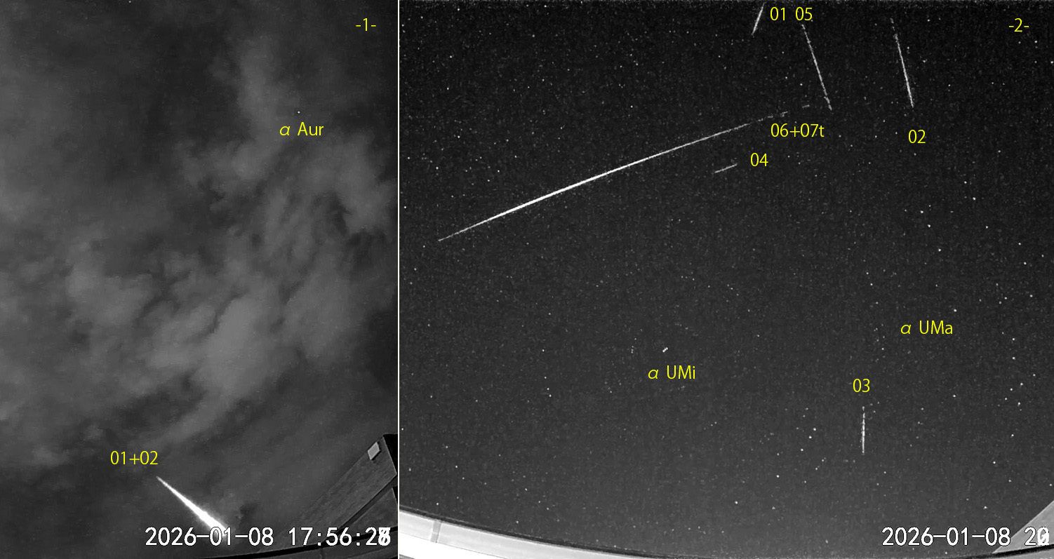 1) 17:56の2コマを、2) 20:56から約2.5時間の7コマを処理しました。 出現した順に数字と記号を始点付近に記入。tは痕traceあり。【流星群記号】Co:かみのけ座流星群、Q:しぶんぎ座流星群 17:56の流星が北海道のTVニュースで紹介された火球です。末端は屋根の影となりました。