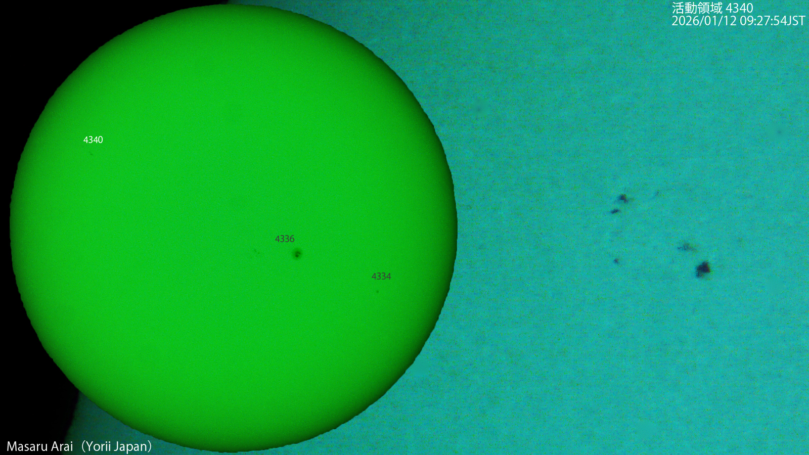 SE120L+DMC-GH1よる 4340( Cao/---) です。 NICT情報:太陽面東端付近の領域で、12日8時14分JSTにM3.3のLDEフレアが発生しました。