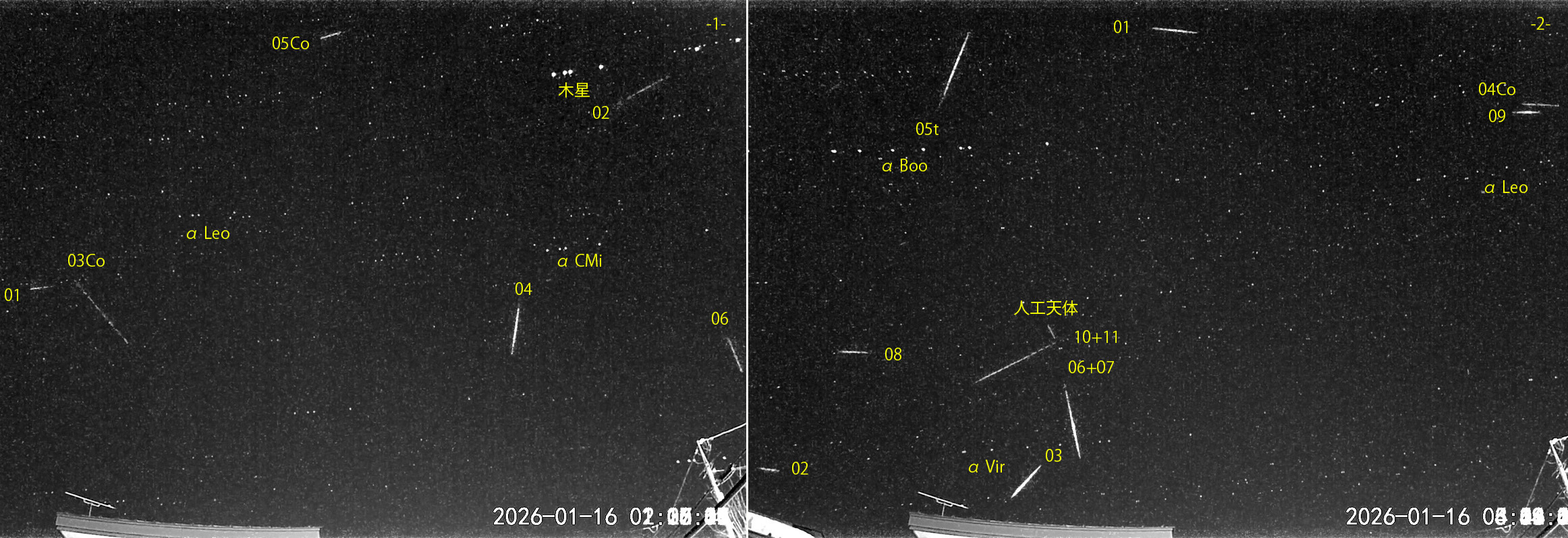 1) 01:02から約2時間の6コマを、2) 03:02から約2時間の11コマを処理しました。夕方から快晴が続き、朝の最低気温マイナス13℃。 出現した順に数字と記号を始点付近に記入。tは痕traceあり。【流星群記号】Co:かみのけ座流星群