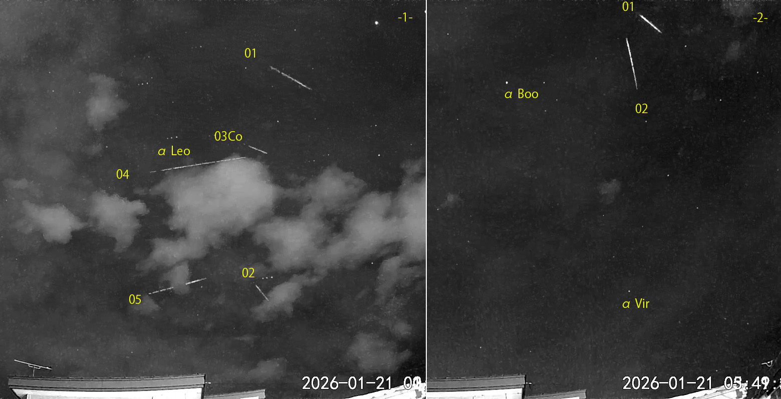 1) 00:53から約2時間の5コマを、2) 03:41から約2時間の2コマを処理しました。 出現した順に数字と記号を始点付近に記入。tは痕traceあり。【流星群記号】Co:かみのけ座流星群 寒気の影響で流れ雲多く、朝の最低気温マイナス11℃。