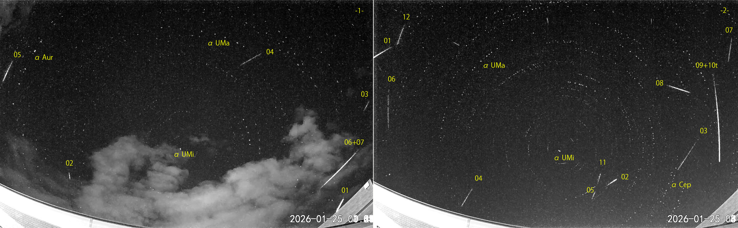 1) 00:26から約2時間の7コマを、2) 03:25から約2時間の12コマを処理しました。 出現した順に数字と記号を始点付近に記入。tは痕traceあり。【流星群記号】Co:かみのけ座流星群。