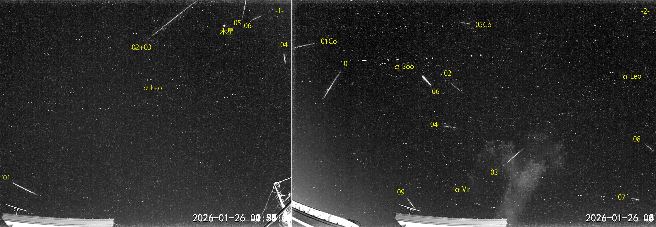 1) 00:30から約2時間の6コマを、2) 03:03から約2.5時間の10コマを処理しました。 出現した順に数字と記号を始点付近に記入。tは痕traceあり。【流星群記号】Co:かみのけ座流星群。 ほぼ快晴が続き、朝の最低気温はマイナス17℃。